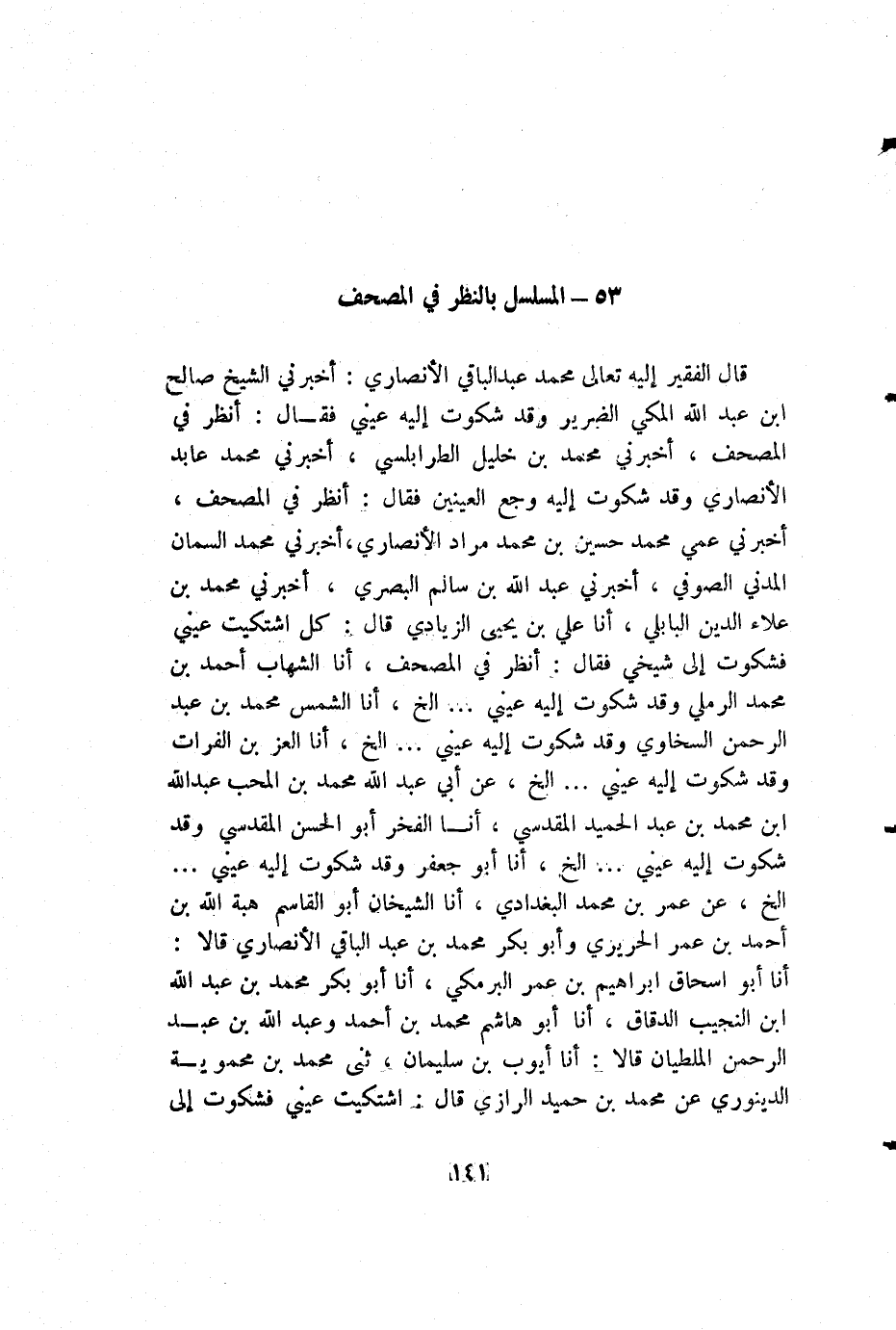 قال الفقير إليه تعالى محمد عبد الباقي الأنصاري: أخبرني الشيخ صالح بن عبد الله المكي الضرير وقد شكوت إليه عيني فقال: أنظر في المصحف، أخبرني محمد بن خليل الطرابلسي، أخبرني محمد عابد الأنصاري وقد شكوت إليه وجع العينين فقال: أنظر في المصحف، أخبرني عمي محمد حسين بن محمد مراد الأنصاري، أخبرني محمد السمان المدني الصوفي، أخبرني عبد الله بن سالم البصري، أخبرني محمد بن علاء الدين البابلي، أنا علي بن يحيى الزيادي قال: كل اشتكيت عيني فشكوت إلى شيخي فقال: أنظر في المصحف، أنا الشهاب أحمد بن محمد الرملي وقد شكوت إليه عيني .. .. الخ، أنا الشمس محمد بن عبد الرحمن السخاوي وقد شكوت إليه عيني .. .. الخ، أنا العز بن الفرات وقد شكوت إليه عيني .. الخ، عن أبي عبد الله محمد بن المحب عبد الله بن محمد بن عبد الحميد المقدسي، أنا الفخر أبو الحسن المقدسي وقد شكوت إليه عيني .. .. الخ، أنا أبو جعفر وقد شكوت إليه عيني .. .. الخ، عن عمر بن محمد البغدادي، أنا الشيخان أبو القاسم هبة الله بن أحمد بن عمر الحريري وأبو بكر محمد بن عبد الباقي الأنصاري قالا: أنا أبو إسحاق إبراهيم بن عمر البرمكي، أنا أبو بكر محمد بن عبد الله ابن النجيب الدقاق، أنا أبو هاشم محمد بن أحمد وعبد الله بن عبد الرحمن الملطيان قالا: أنا أيوب بن سليمان، ثنى محمد بن محموية الدينوري عن محمد بن حميد الرازي قال: اشتكيت عيني فشكوت إلى