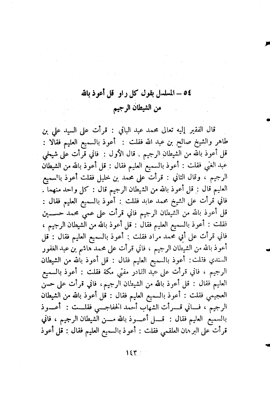 قال الفقير إليه تعالى محمد عبد الباقي: قرأت على السيد علي بن طاهر والشيخ صالح بن عبد الله فقلت: أعوذ بالسميع العليم فقالا: قل أعوذ بالله من الشيطان الرجيم. قال الأول: فإني قرأت على شيخي عبد الغني فقلت: أعوذ بالسميع العليم فقال: قل أعوذ بالله من الشيطان الرجيم، وقال الثاني: قرأت على محمد بن خليل فقلت أعوذ بالسميع العليم قال: قل أعوذ بالله من الشيطان الرجيم قال: كل واحد منهما. فإني قرأت على الشيخ محمد عابد فقلت: أعوذ بالسميع العليم فقال: قل أعوذ بالله من الشيطان الرجيم فإني قرأت على عمي محمد حسين فقلت: أعوذ بالسميع العليم فقال: قل أعوذ بالله من الشيطان الرجيم، فإن قرأت على أبي محمد مراد فقلت: أعوذ بالسميع العليم فقال: قل أعوذ بالله من الشيطان الرجيم، فإني قرأت على محمد هاشم بن عبد الغفور السندي فقلت: أعوذ بالسميع العليم فقال: قل أعوذ بالله من الشيطان الرجيم، فإني قرأت على عبد القادر مفتي مكة فقلت: أعوذ بالسميع العليم فقال: قل أعوذ بالله من الشيطان الرجيم، فإني قرأت على حسن العجيمي فقلت: أعوذ بالسميع العليم فقال: قل أعوذ بالله من الشيطان الرجيم، فإني قرأت الشهاب أحمد الخفاجي فقلت: أعوذ بالسميع العليم فقال: قل أعوذ بالله من الشيطان الرجيم، فإن قرأت على البرهان العلقمي فقلت: أعوذ بالسميع العليم فقال: قل أعوذ