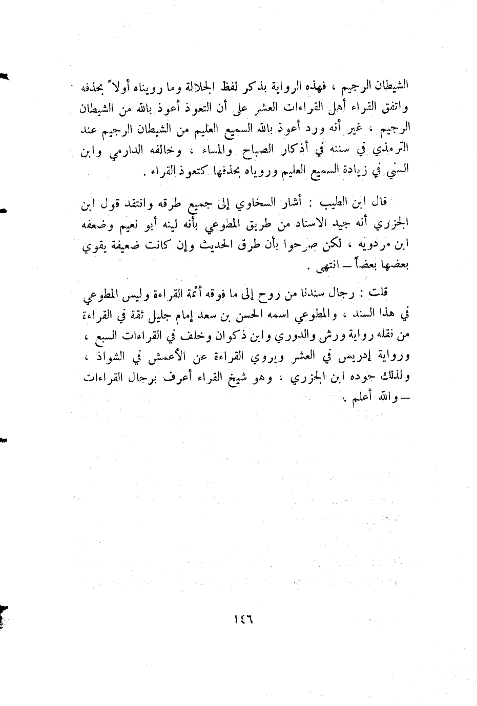 الشيطان الرجيم، فهذه الرواية بذكر لفظ الجلالة وما رويناه أولاً بحذفه واتفق القراء أهل القراءات العشر على أن التعوذ أعوذ بالله من الشيطان الرجيم، غير أنه ورد أعوذ بالله السميع العليم من الشيطان الرجيم عند الترمذي في سننه في أذكار الصباح والمساء، وخالفه الدارمي وابن السني في زيادة السميع العليم وروياه بحذفها كتعوذ القراء.