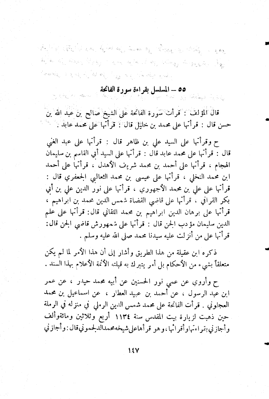 ح وأروي عن عمي نور الحسنين عن أبيه محمد حيدر، عن عمر بن عبد الرسول، عن أحمد بن عبيد العطار، عن إسماعيل بن محمد العجلوني. قرأت الفاتحة على محمد شمس الدين الرملي في منزله في الرملة حين ذهبت لزيارة بيت المقدس سنة 1134 أربع وثلاثين ومائة وألف وأجازني بقراءتها وأقرائها، وهو قرأها على شيخه محمد الدلجموني قال: وأجازني
