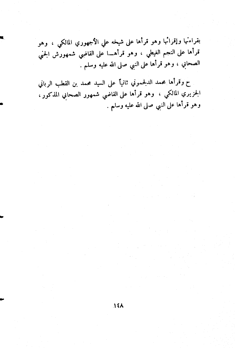 ح وقرأها محمد الدلجموني ثانياً على السيد محمد بن القطب الرباني الجزيري المالكي، وهو قرأها على القاضي شمهور الصحابي المذكور، وهو قرأها على النبي صلى الله عليه وسلم.