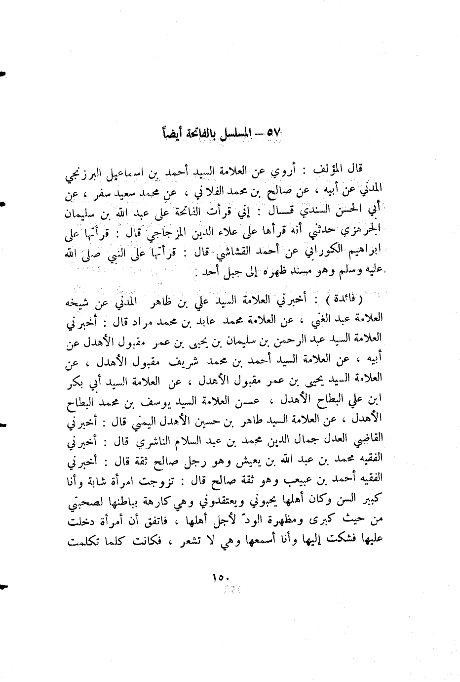قال المؤلف: أروي عن العلامة السيد أحمد بن إسماعيل البرزنجي المدني عن أبيه، عن صالح بن محمد الفلاني، عن محمد سعيد سفر، عن أبي الحسن السندي قال: إني قرأت الفاتحة على عبد الله بن سليمان الجرهزي حدثني أنه قرأها على علاء الدين المزجاجي قال: قرأتها على إبراهيم الكورابي عن أحمد القشاشي قال: قرأتها على النبي صلى الله عليه وسلم وهو مسند ظهره إلى جبل أحد.