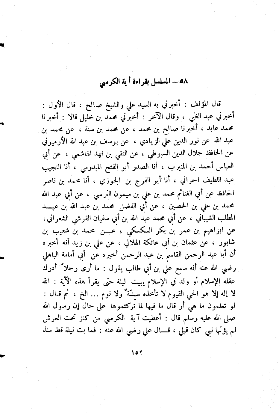قال المؤلف: أخبرني به السيد علي والشيخ صالح، قال الأول: أخبرني عبد الغني، وقال الآخر: أخبرني محمد بن خليل قالا: أخبرنا محمد عابد، أخبرنا صالح بن محمد، عن محمد بن سنة، عن محمد بن عبد الله عن نور الدين علي الزيادي، عن يوسف بن عبد الله الأرميوني عن الحافظ جلال الدين السيوطي، عن التقي بن فهد الهاشمي، عن أبي العباس أحمد بن المنيرب، أنا الصدر أبو الفتح الميدومي، أنا النجيب عبد اللطيف الحراني، أنا أبو الفرج بن الجوزي، أنا محمد بن ناصر الحافظ عن أبي الغنائم محمد بن علي بن ميمون النرسي، عن أبي عبد الله محمد بن علي بن الحصين، عن أبي الفضل محمد بن عبد الله بن عبد المطلب الشيباني، عن أبي محمد عبد الله بن أبي سفيان القرشي الشعراني، عن إبراهيم بن عمر بن بكر السكسكي، عن محمد بن شعيب بن شابور، عن عثمان بن أبي عاتكة الهلالي، عن علي بن زيد أنه أخبره أن أبا عبد الرحمن القاسم بن عبد الرحمن أخبره عن أبي أمامة الباهلي رضي الله عنه أنه سمع علي بن أبي طالب يقول: ما أرى رجلاً أدرك عقله الإسلام أو ولد في الإسلام يبيت ليلة حتى يقرأ هذه الآية: الله لا إله إلا هو الحي القيوم لا تأخذه سنة ولا نوم .. .. الخ، ثم قال: لو تعلمون ما هي أو قال ما فيها لما تركتموها على حال إن رسول الله صلى الله عليه وسلم قال: أعطيت آية الكرسي من كنز تحت العرش لم يؤتها نبي كان قبلي، قال علي رضي الله عنه: فما بت ليلة قط منذ