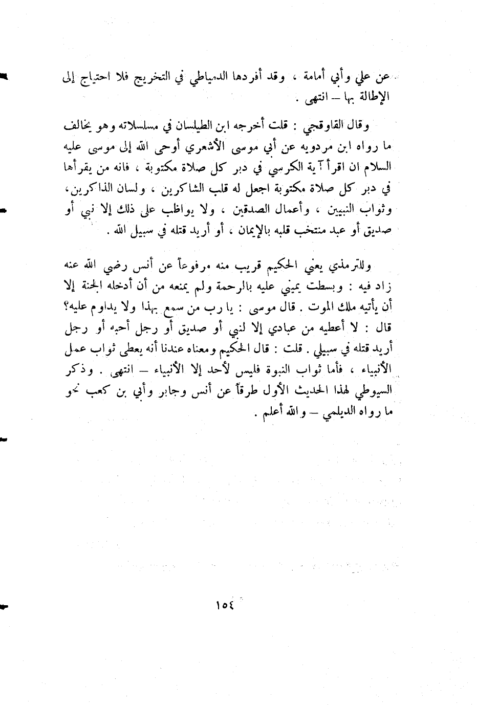 وقال القاوقجي: قلت أخرجه ابن الطيلسان في مسلسلاته وهو يخالف ما رواه ابن مردويه عن أبي موسى الأشعري أوحى الله إلى موسى عليه السلام أن اقرأ آية الكرسي في دبر كل صلاة مكتوبة، فإنه من يقرأها في دبر كل صلاة مكتوبة اجعل له قلب الشاكرين، ولسان الذاكرين، وثواب النبيين، وأعمال الصديقين، ولا يواظب على ذلك إلا نبي أو صديق أو عبد منتخب قلبه بالإيمان، أو أريد قتله في سبيل الله.