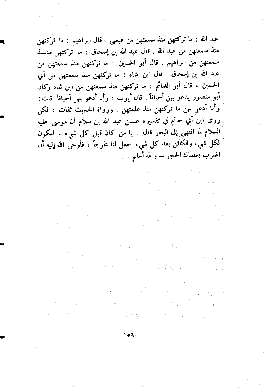 عبد الله: ما تركتهن منذ سمعتهن من عيسى. قال إبراهيم: ما تركتهن منذ سمعتهن من عبد الله. قال عبد الله بن إسحاق: ما تركتهن منذ سمعتهن من إبراهيم. قال أبو الحسين: ما تركتهن منذ سمعتهن من عبد الله بن إسحاق. قال ابن شاه: ما تركتهن منذ سمعتهن من أبي الحسين، قال أبو الغنائم: ما تركتهن منذ سمعتهن من ابن شاه وكان أبو منصور يدعو بهن أحيانا. قال أيوب: وأنا أدعو بهن أحيانا قلت: وأنا أدعو بهن ما تركتهن منذ علمتهن. ورواة الحديث ثقات، لكن روى ابن أبي حاتم في تفسيره عن عبد الله بن سلام أن موسى عليه السلام لما انتهى إلى البحر قال: يا من كان قبل كل شيء، المكون لكل شيء والكائن بعد كل شيء اجعل لنا مخرجاً، فأوحى الله إليه أن اضرب بعصاك الحجر - والله أعلم.