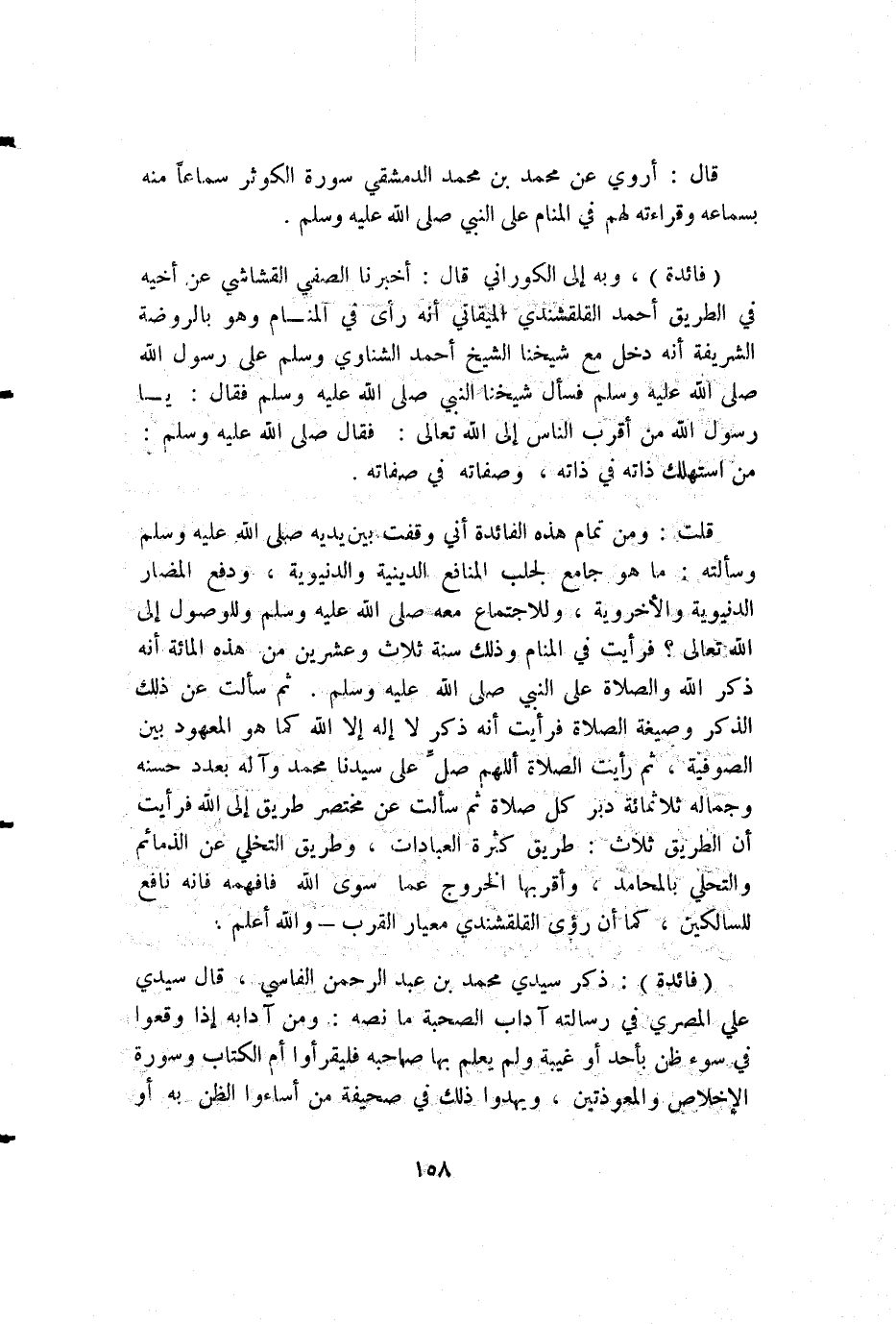 قلت: ومن تمام هذه الفائدة أني وقفت بين يديه صلى الله عليه وسلم وسألته: ما هو جامع لجلب المنافع الدينية والدنيوية، ودفع المضار الدنيوية والأخروية، وللاجتماع معه صلى الله عليه وسلم وللوصول إلى الله تعالى؟ فرأيت في المنام وذلك سنة ثلاث وعشرين من هذه المائة أنه ذكر الله والصلاة على النبي صلى الله عليه وسلم. ثم سألت عن ذلك الذكر وصيغة الصلاة فرأيت أنه ذكر لا إله إلا الله كما هو المعهود بين الصوفية، ثم رأيت الصلاة اللهم صل على سيدنا محمد وآله بعدد حسنه وجماله ثلاثمائة دبر كل صلاة ثم سألت عن مختصر طريق إلى الله فرأيت أن الطريق ثلاث: طريق كثرة العبادات، وطريق التخلي عن الذمائم والتحلي بالمحامد، وأقربها الخروج عما سوى الله فافهمه فإنه نافع للسالكين، كما أن رؤى القلقشندي معيار القرب - والله أعلم.