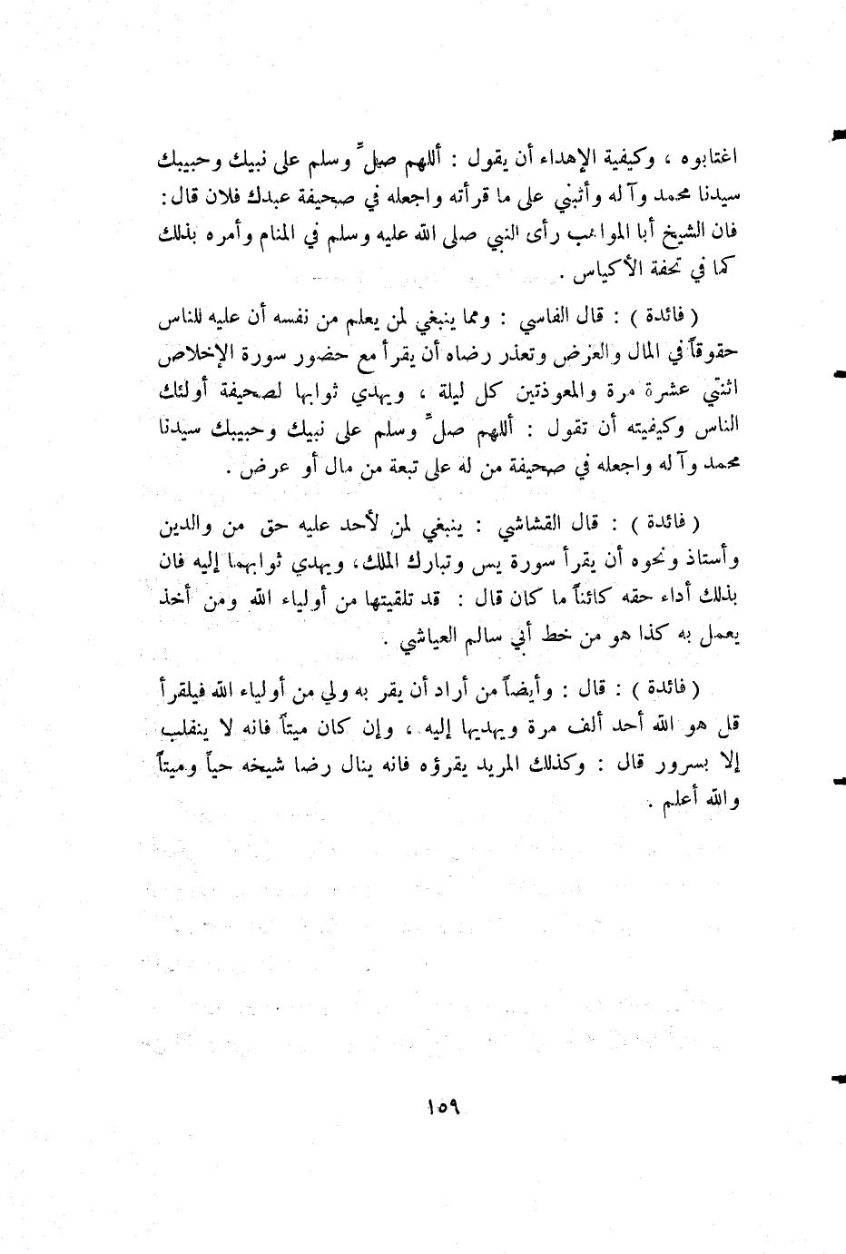 (فائدة): قال القشاشي: ينبغي لمن لأحد عليه حق من والدين وأستاذ ونحوه أن يقرأ سورة يس وتبارك الملك، ويهدي ثوابهما إليه فإن بذلك أداء حقه كائنا ما كان قال: قد تلقيتها من أولياء الله ومن أخذ يعمل به كذا هو من خط أبي سالم العياشي.