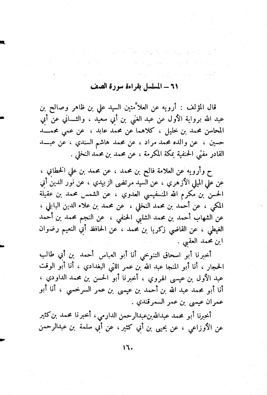 قال المؤلف: أرويه عن العلامتين السيد علي بن ظاهر وصالح بن عبد الله برواية الأول عن عبد الغني بن أبي سعيد، والثاني عن أبي المحاسن محمد بن خليل، كلاهما عن محمد عابد، عن عمي محمد حسين، عن والده محمد مراد، عن محمد هاشم السندي، عن عبد القادر مفتي الحنفية بمكة المكرمة، عن محمد بن محمد النخلي.