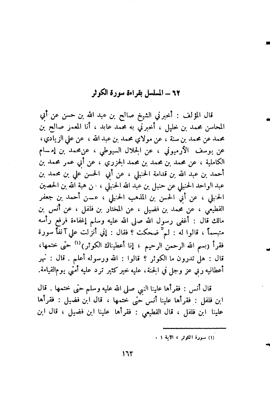 قال المؤلف: أخبرني الشيخ صالح بن عبد الله بن حسن عن أبي المحاسن محمد بن خليل، أخبرني به محمد عابد، أنا المعمر صالح بن محمد عن محمد بن سنة، عن مولاي محمد بن عبد الله، عن علي الزيادي، عن يوسف الأرميوني، عن الجلال السيوطي، عن محمد بن إمام الكاملية، عن محمد بن محمد بن محمد الجزري، عن أبي عمر محمد بن أحمد بن عبد الله بن قدامة الحنبلي، عن أبي الحسن علي بن محمد بن عبد الواحد الحنبلي عن حنبل بن عبد الله الحنبلي، عن هبة الله بن الحصين الحنبلي، عن أبي الحسن بن المذهب الحنبلي، عن أحمد بن جعفر القطيعي، عن محمد بن فضيل، عن المختار بن فلفل، عن أنس بن مالك قال: أغفى رسول الله صلى الله عليه وسلم إغفاءة فرفع رأسه متبسما، قالوا له: لم ضحكت؟ فقال: إني أنزلت علي آنفاً سورة فقرأ {بسم الله الرحمن الرحيم؛ إنا أعطيناك الكوثر} حتى ختمها، قال: هل تدرون ما الكوثر؟ قالوا: الله ورسوله أعلم. قال: نهر أعطانيه ربي عز وجل في الجنة، عليه خير كثير ترد عليه أمتي يوم القيامة.