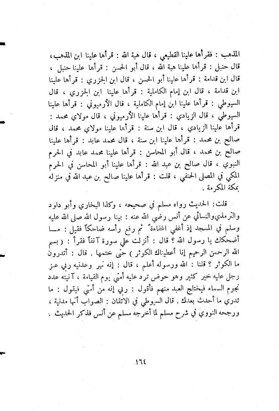 المذهب: فقرأها علينا القطيعي، قال هبة الله: قرأها علينا ابن المذهب، قال حنبل: قرأها علينا هبة الله، قال أبو الحسن: قرأها علينا حنبل، قال ابن قدامة: قرأها علينا أبو الحسن، قال ابن الجزري: قرأها علينا ابن قدامة، قال ابن إمام الكاملية: قرأها علينا ابن الجزري، قال السيوطي: قرأها علينا ابن إمام الكاملية، قال الأرميوني: قرأها علينا السيوطي، قال الزيادي: قرأها علينا الأرميوني، قال مولاي محمد: قرأها علينا الزيادي، قال ابن سنة: قرأها علينا مولاي محمد، قال صالح بن محمد: قرأها علينا ابن سنة، قال محمد عابد: قرأها علينا صالح بن محمد، قال أبو المحاسن: قرأها علينا محمد عابد في الحرم النبوي، قال صالح بن عبد الله: قرأها علينا أبو المحاسن في الحرم المكي في المصلى الحنفي، قلت: قرأها علينا صالح بن عبد الله في منزله بمكة المكرمة.