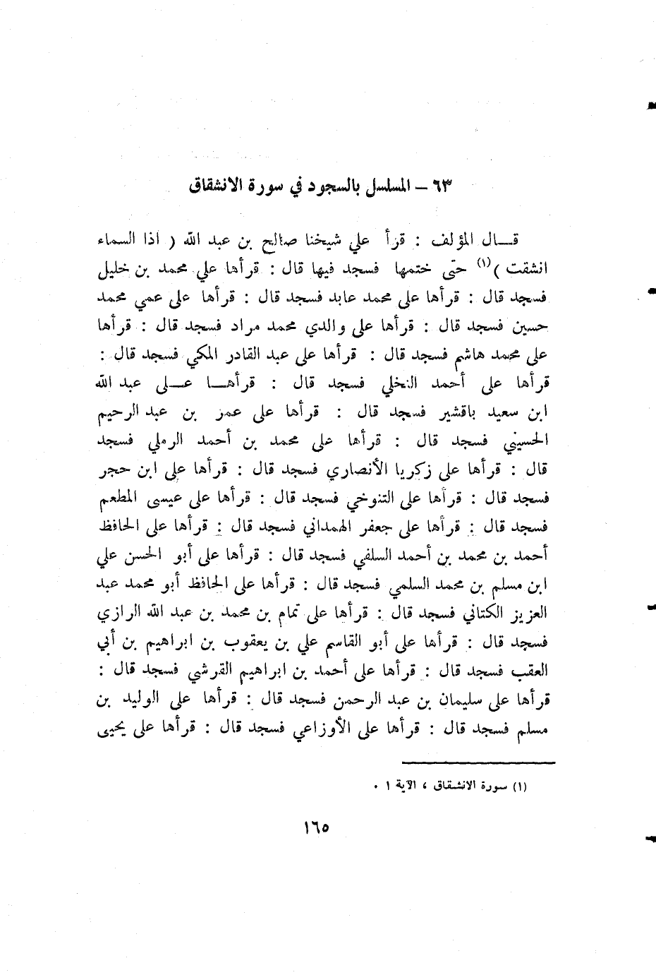 قال المؤلف: قرأ علي شيخنا صالح بن عبد الله {إذا السماء انشقت} حتى ختمها فسجد فيها قال: قرأها علي محمد بن خليل فسجد قال: قرأها على محمد عابد فسجد قال: قرأها على عمي محمد حسين فسجد قال: قرأها على والدي محمد مراد فسجد قال: قرأها على محمد هاشم فسجد قال: قرأها على عبد القادر المكي فسجد قال: قرأها على أحمد النخلي فسجد قال: قرأها على عبد الله بن سعيد باقشير فسجد قال: قرأها على عمر بن عبد الرحيم الحسيني فسجد قال: قرأها على محمد بن أحمد الرملي فسجد قال: قرأها على زكريا الأنصاري فسجد قال: قرأها على ابن حجر فسجد قال: قرأها على التنوخي فسجد قال: قرأها على عيسى المطعم فسجد قال: قرأها على جعفر الهمداني فسجد قال: قرأها على الحافظ أحمد بن محمد بن أحمد السلفي فسجد قال: قرأها على أبو الحسن علي بن مسلم بن محمد السلمي فسجد قال: قرأها على الحافظ أبو محمد عبد العزيز الكتاني فسجد قال: قرأها على تمام بن محمد بن عبد الله الرازي فسجد قال: قرأها على أبو القاسم علي بن يعقوب بن إبراهيم بن أبي العقب فسجد قال: قرأها على أحمد بن إبراهيم القرشي فسجد قال: قرأها على سليمان بن عبد الرحمن فسجد قال: قرأها على الوليد بن مسلم فسجد قال: قرأها على الأوزاعي فسجد قال: قرأها على يحيى