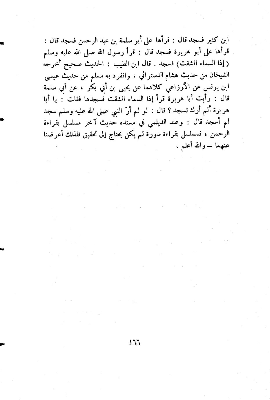 ابن كثير فسجد قال: قرأها على أبو سلمة بن عبد الرحمن فسجد قال: قرأها على أبو هريرة فسجد قال: قرأ رسول الله صلى الله عليه وسلم {إذا السماء انشقت} فسجد. قال ابن الطيب: الحديث صحيح أخرجه الشيخان من حديث هشام الدستوائي، وانفرد به مسلم من حديث عيسى بن يونس عن الأوزاعي كلاهما عن يحيى بن أبي بكر، عن أبي سلمة قال: رأيت أبا هريرة قرأ إذا السماء انشقت فسجدها فقلت: يا أبا هريرة ألم أرك تسجد؟ قال: لو لم أر النبي صلى الله عليه وسلم سجد لم أسجد قال: وعند الديلمي في مسنده حديث آخر مسلسل بقراءة الرحمن، فمسلسل بقراءة سورة لم يكن يحتاج إلى تحقيق فلذلك أعرضنا عنهما - والله أعلم.