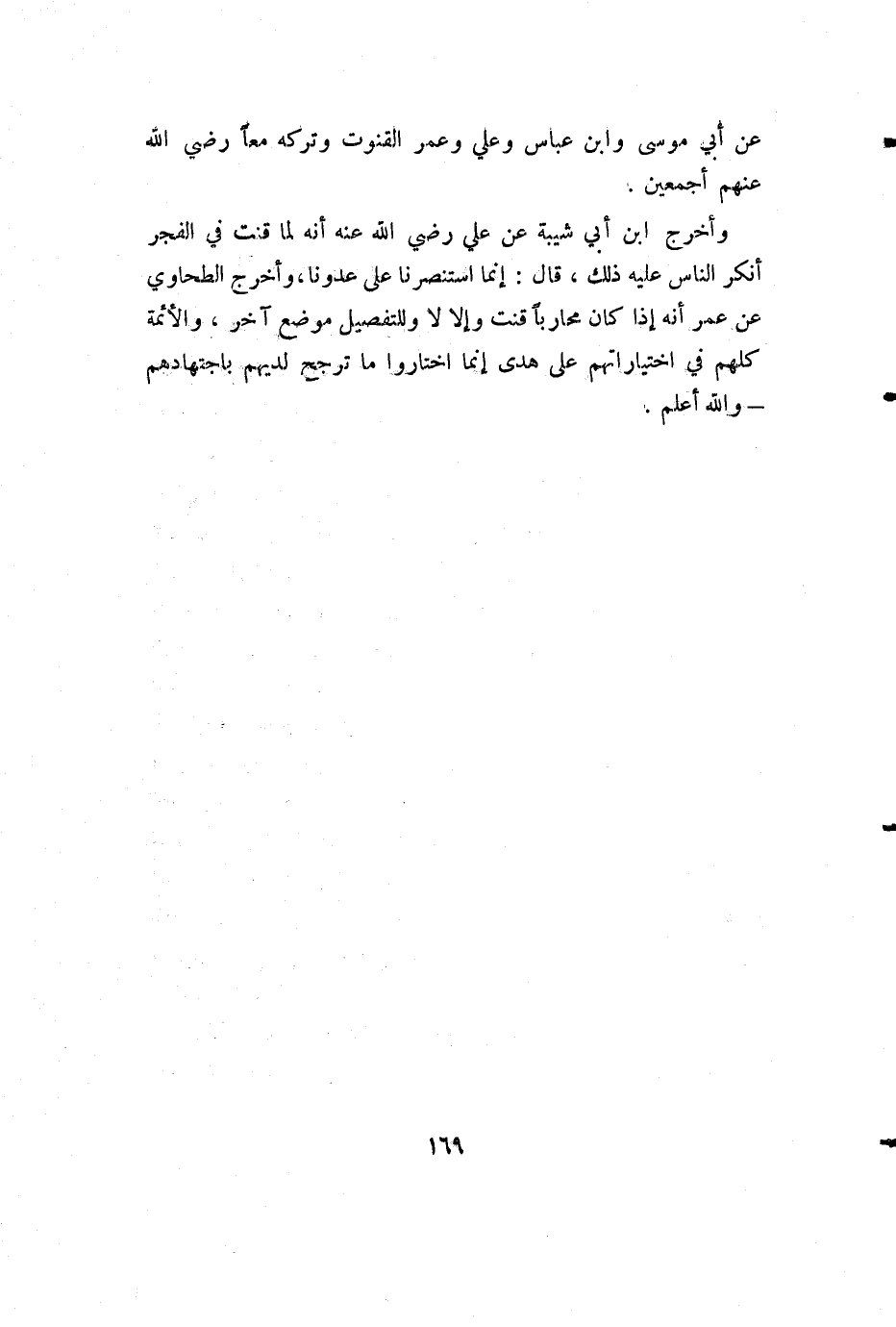 وأخرج ابن أبي شيبة عن علي رضي الله عنه أنه لما قنت في الفجر أنكر الناس عليه ذلك، قال: إنما استنصرنا على عدونا، وأخرج الطحاوي عن عمر أنه إذا كان محارباً قنت وإلا لا وللتفصيل موضع آخر، والأئمة كلهم في اختياراتهم على هدى إنما اختاروا ما ترجح لديهم باجتهادهم - والله أعلم.