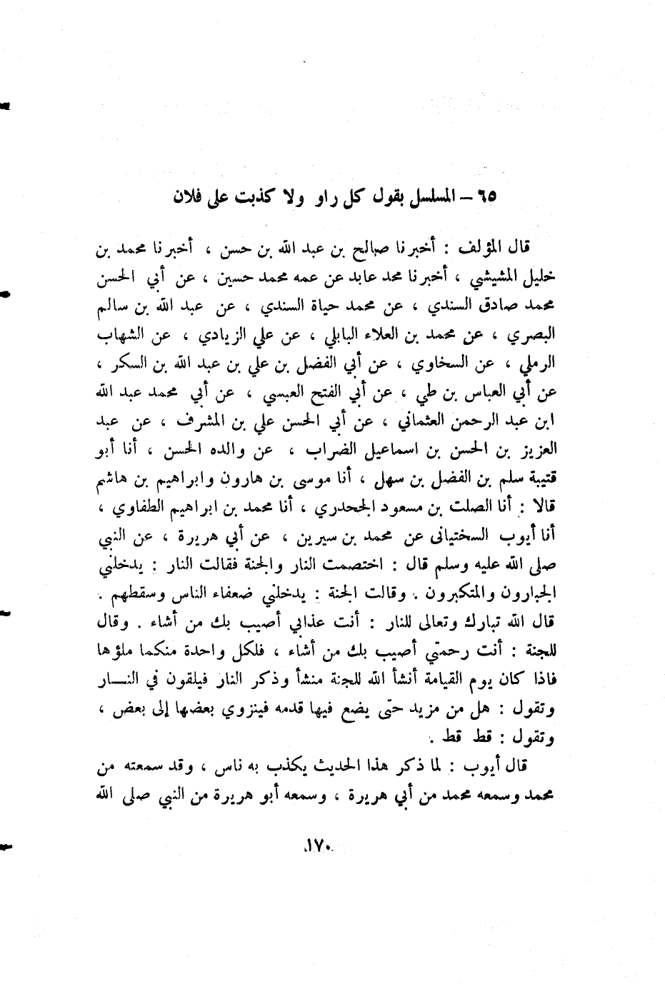 قال المؤلف: أخبرنا صالح بن عبد الله بن حسن، أخبرنا محمد بن خليل المشيشي، أخبرنا محمد عابد عن عمه محمد حسين، عن أبي الحسن محمد صادق السندي، عن محمد حياة السندي، عن عبد الله بن سالم البصري، عن محمد بن العلاء البابلي، عن علي الزيادي، عن الشهاب الرملي، عن السخاوي، عن أبي الفضل بن علي بن عبد الله بن السكر، عن أبي العباس بن طي، عن أبي الفتح العبسي، عن أبي محمد عبد الله بن عبد الرحمن العثماني، عن أبي الحسن علي بن المشرف، عن عبد العزيز بن الحسن بن إسماعيل الضراب، عن والده الحسن، أنا أبو قتيبة سلم بن الفضل بن سهل، أنا موسى بن هارون وإبراهيم بن هاشم قالا: أنا الصلت بن مسعود الجحدري، أنا محمد بن إبراهيم الطفاوي، أنا أيوب السختياني عن محمد بن سيرين، عن أبي هريرة، عن النبي صلى الله عليه وسلم قال: اختصمت النار والجنة فقالت النار: يدخلني الجبارون والمتكبرون. وقالت الجنة: يدخلني ضعفاء الناس وسقطهم. قال الله تبارك وتعالى للنار: أنت عذابي أصيب بك من أشاء. وقال للجنة: أنت رحمتي أصيب بك من أشاء، فلكل واحدة منكما ملؤها فإذا كان يوم القيامة أنشأ الله للجنة منشأ وذكر النار فيلقون في النار وتقول: هل من مزيد حتى يضع فيها قدمه فينزوي بعضها إلى بعض، وتقول: قط قط.