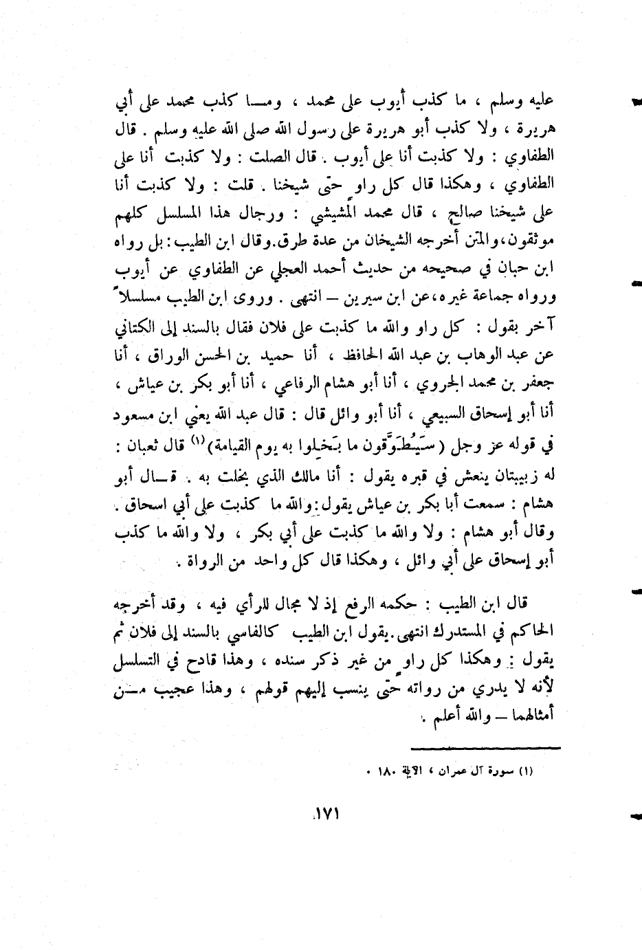 عليه وسلم، ما كذب أيوب على محمد، وما كذب محمد على أبي هريرة، ولا كذب أبو هريرة على رسول الله صلى الله عليه وسلم. قال الطفاوي: ولا كذبت أنا على أيوب. قال الصلت: ولا كذبت أنا على الطفاوي، وهكذا قال كل راو حتى شيخنا. قلت: ولا كذبت أنا على شيخنا صالح، قال محمد المشيشي: ورجال هذا المسلسل كلهم موثقون، والمتن أخرجه الشيخان من عدة طرق. وقال ابن الطيب: بل رواه ابن حبان في صحيحه من حديث أحمد العجلي عن الطفاوي عن أيوب ورواه جماعة غيره، عن ابن سيرين - انتهى. وروى ابن الطيب مسلسلاً آخر بقول: كل راو والله ما كذبت على فلان فقال بالسند إلى الكتاني عن عبد الوهاب بن عبد الله الحافظ، أنا حميد بن الحسن الوراق، أنا جعفر بن محمد الجروي، أنا أبو هشام الرفاعي، أنا أبو بكر بن عياش، أنا أبو إسحاق السبيعي، أنا أبو وائل قال: قال عبد الله يعني ابن مسعود في قوله عز وجل: {سيطوقون ما بخلوا به يوم القيامة} قال ثعبان: له زبيبتان ينعش في قبره يقول: أنا مالك الذي بخلت به. قال أبو هشام: سمعت أبا بكر بن عياش يقول: والله ما كذبت على أبي إسحاق. وقال أبو هشام: ولا والله ما كذبت على أبي بكر، ولا والله ما كذب أبو إسحاق على أبي وائل، وهكذا قال كل واحد من الرواة.