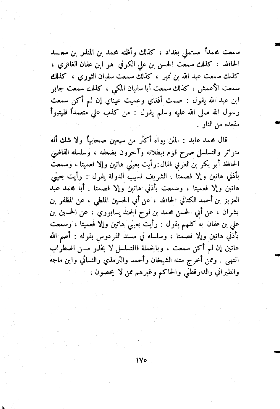 سمعت محمدا مستملي بغداد، كذلك وأظنه محمد بن المنذر بن سعد الحافظ، كذلك سمعت الحسن بن علي الكوفي هو ابن عفان الغافري، كذلك سمعت عبد الله بن نمير، كذلك سمعت سفيان الثوري، كذلك سمعت الأعمش، كذلك سمعت أبا سفيان المكي، كذلك سمعت جابر بن عبد الله يقول: صمت أذناي وعميت عيناي إن لم أكن سمعت رسول الله صلى الله عليه وسلم يقول: من كذب علي متعمداً فليتبوأ مقعده من النار.