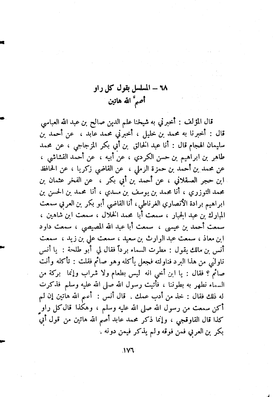 قال المؤلف: أخبرني به شيخنا علم الدين صالح بن عبد الله العباسي قال: أخبرنا به محمد بن خليل، أخبرني محمد عابد، عن أحمد بن سليمان الهجام قال: أنا عبد الخالق بن أبي بكر المزجاجي، عن محمد طاهر بن إبراهيم بن حسن الكردي، عن أبيه، عن أحمد القشاشي، عن محمد بن أحمد بن حمزة الرملي، عن القاضي زكريا، عن الحافظ ابن حجر العسقلاني، عن أحمد بن أبي بكر، عن الفخر عثمان بن محمد التوزري، أنا محمد بن يوسف بن مسدي، أنا محمد بن الحسن بن إبراهيم برادة الأنصاري الغرناطي، أنا القاضي أبو بكر بن العربي سمعت المبارك بن عبد الجبار، سمعت أبا محمد الخلال، سمعت ابن شاهين، سمعت أحمد بن عيسى، سمعت أبا عبد الله المصيصي، سمعت داود بن معاذ، سمعت عبد الوارث بن سعيد، سمعت علي بن زيد، سمعت أنس بن مالك يقول: مطرت السماء برداً فقال لي أبو طلحة: يا أنس ناولني من هذا البرد فناولته فجعل يأكله وهو صائم فقلت: تأكله وأنت صائم؟ فقال: يا ابن أخي إنه ليس بطعام ولا شراب وإنما بركة من السماء نطهر به بطوننا، فأتيت رسول الله صلى الله عليه وسلم فذكرت له ذلك فقال: خذ من أدب عمك. قال أنس: أصم الله هاتين إن لم أكن سمعت من رسول الله صلى الله عليه وسلم، وهكذا قال كل راو كذا قال القاوقجي، وإنما ذكر محمد عابد أصم الله هاتين من قول أبي بكر بن العربي فمن فوقه ولم يذكر فيمن دونه.