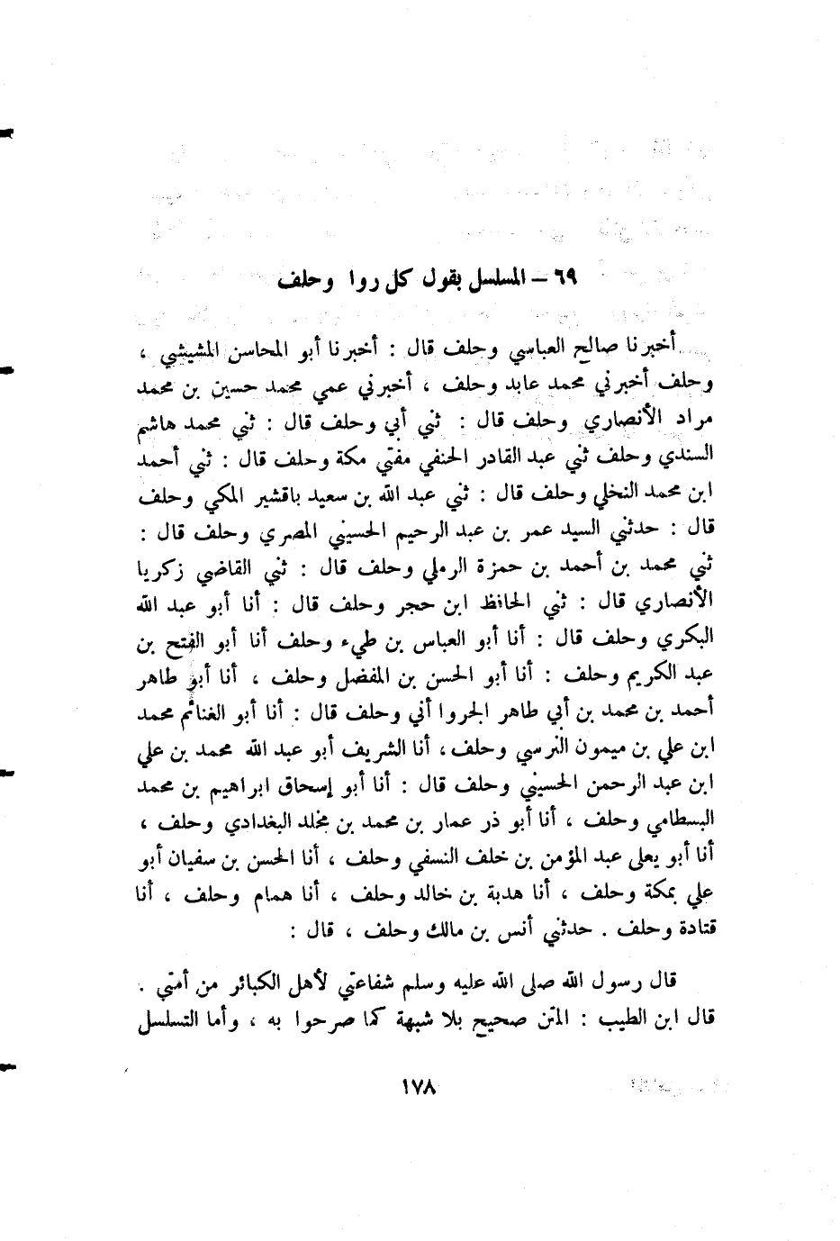 أخبرنا صالح العباسي وحلف قال: أخبرنا أبو المحاسن المشيشي، وحلف أخبرني محمد عابد وحلف، أخبرني عمي محمد حسين بن محمد مراد الأنصاري. وحلف قال: ثني أبي وحلف قال: ثني محمد هاشم السندي وحلف ثني عبد القادر الحنفي مفتي مكة وحلف قال: ثني أحمد بن محمد النخلي وحلف قال: ثني عبد الله بن سعيد باقشير المكي وحلف قال: حدثني السيد عمر بن عبد الرحيم الحسيني المصري وحلف قال: ثني محمد بن أحمد بن حمزة الرملي وحلف قال: ثني القاضي زكريا الأنصاري قال: ثني الحافظ ابن حجر وحلف قال: أنا أبو عبد الله البكري وحلف قال: أنا أبو العباس بن طيء وحلف أنا أبو الفتح بن عبد الكريم وحلف: أنا أبو الحسن بن المفضل وحلف، أنا أبو طاهر أحمد بن محمد بن أبي طاهر الجروا أني وحلف قال: أنا أبو الغنائم محمد بن علي بن ميمون النرسي وحلف، أنا الشريف أبو عبد الله محمد بن علي بن عبد الرحمن الحسيني وحلف قال: أنا أبو إسحاق إبراهيم بن محمد البسطامي وحلف، أنا أبو ذر عمار بن محمد بن مخلد البغدادي وحلف، أنا أبو يعلى عبد المؤمن بن خلف النسفي وحلف، أنا الحسن بن سفيان أبو علي بمكة وحلف، أنا هدبة بن خالد وحلف، أنا همام وحلف، أنا قتادة وحلف. حدثني أنس بن مالك وحلف، قال: