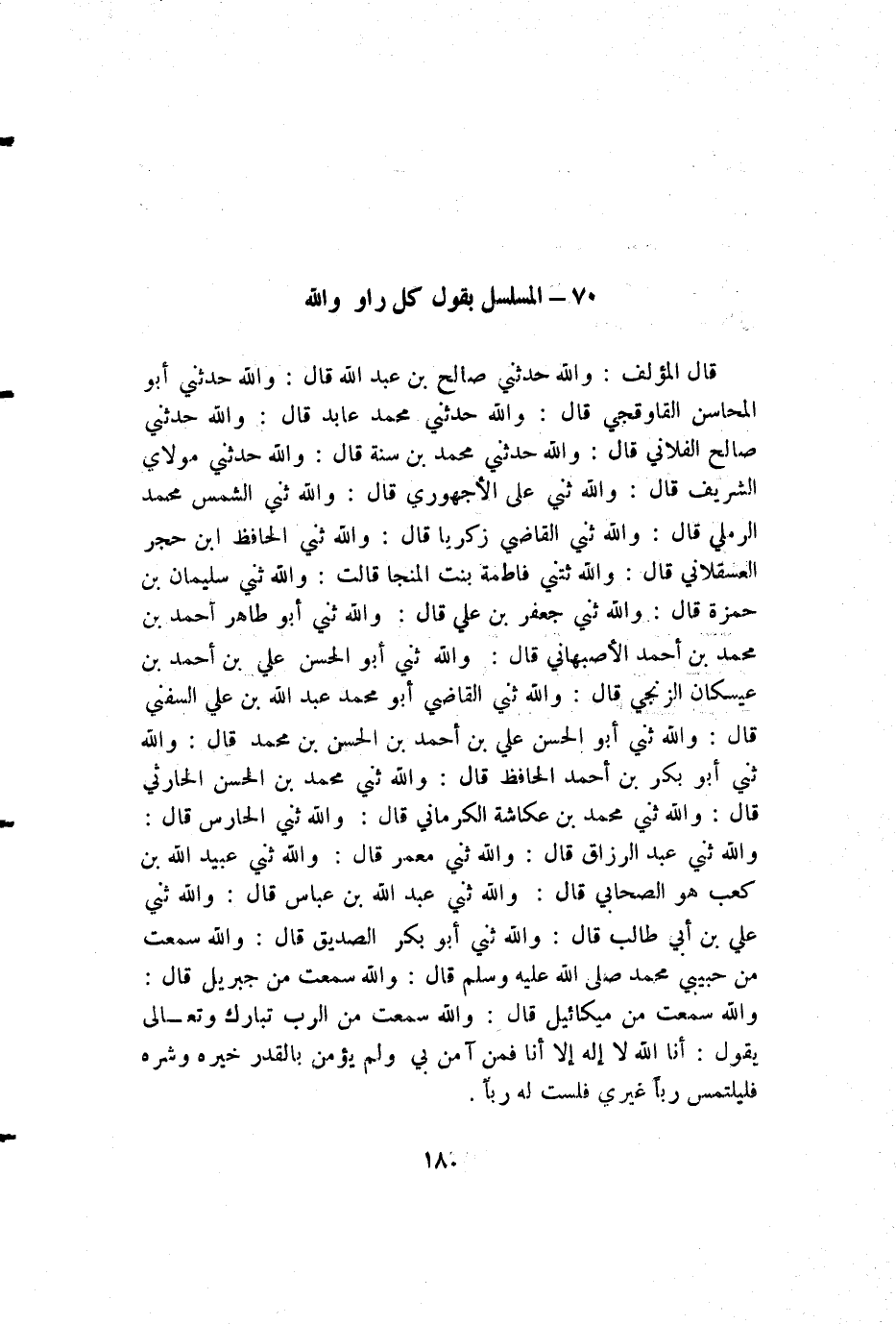 قال المؤلف: والله حدثني صالح بن عبد الله قال: والله حدثني أبو المحاسن القاوقجي قال: والله حدثني محمد عابد قال: والله حدثني صالح الفلاني قال: والله حدثني محمد بن سنة قال: والله حدثني مولاي الشريف قال: والله ثني علي الأجهوري قال: والله ثني الشمس محمد الرملي قال: والله ثني القاضي زكريا قال: والله ثني الحافظ ابن حجر العسقلاني قال: والله ثتني فاطمة بنت المنجا قالت: والله ثني سليمان بن حمزة قال: والله ثني جعفر بن علي قال: والله ثني أبو طاهر أحمد بن محمد بن أحمد الأصبهاني قال: والله ثني أبو الحسن علي بن أحمد بن عيسكان الزنجي قال: والله ثني القاضي أبو محمد عبد الله بن علي السفني قال: والله ثني أبو الحسن علي بن أحمد بن الحسن بن محمد قال: والله ثني أبو بكر بن أحمد الحافظ قال: والله ثني محمد بن الحسن الحارثي قال: والله ثني محمد بن عكاشة الكرماني قال: والله ثني الحارس قال: والله ثني عبد الرزاق قال: والله ثني معمر قال: والله ثني عبيد الله بن كعب هو الصحابي قال: والله ثني عبد الله بن عباس قال: والله ثني علي بن أبي طالب قال: والله ثني أبو بكر الصديق قال: والله سمعت من حبيبي محمد صلى الله عليه وسلم قال: والله سمعت من جبريل قال: والله سمعت من ميكائيل قال: والله سمعت من الرب تبارك وتعالى يقول: أنا الله لا إله إلا أنا فمن آمن بي ولم يؤمن بالقدر خيره وشره فليلتمس رباً غيري فلست له رباً.