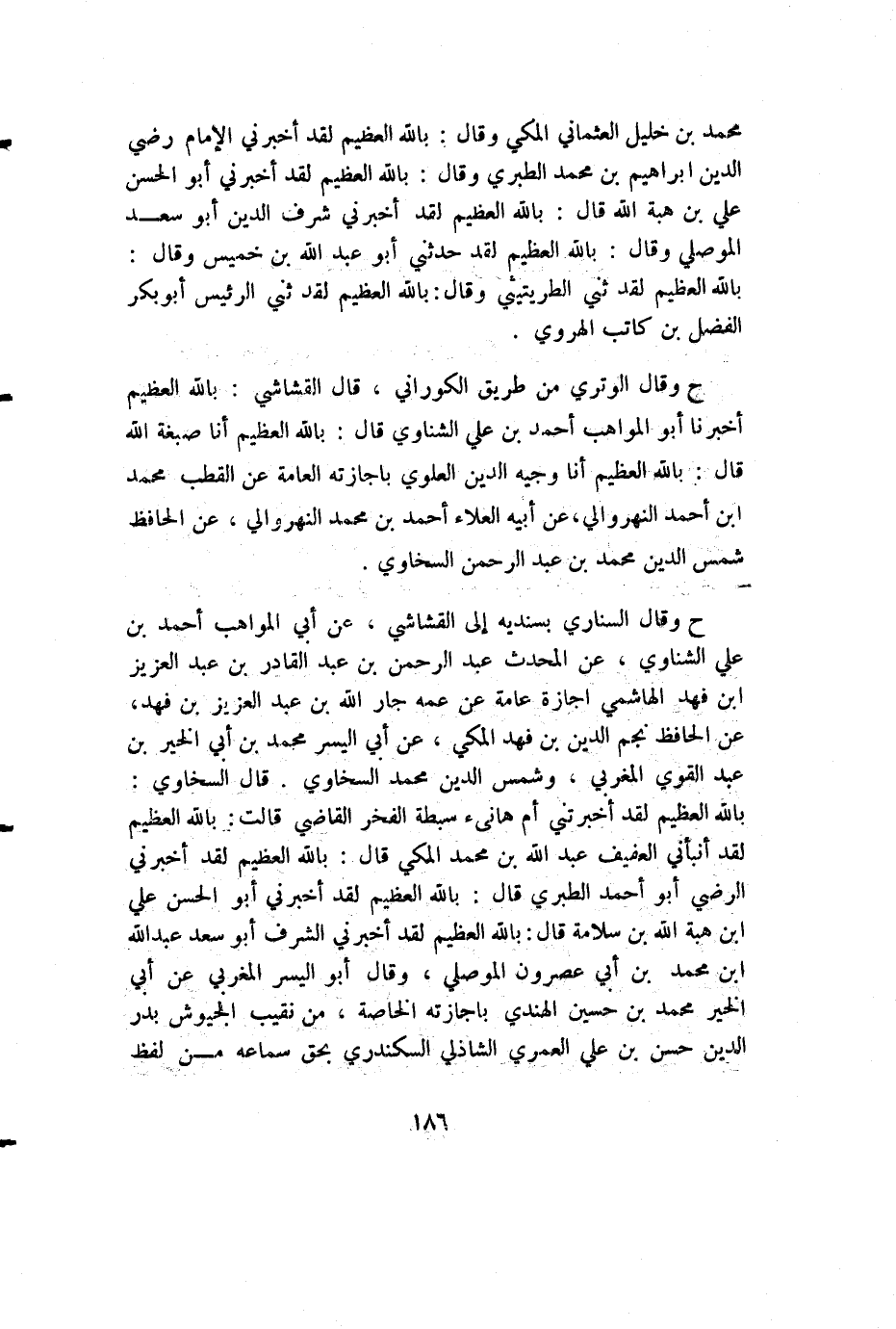 محمد بن خليل العثماني المكي وقال: بالله العظيم لقد أخبرني الإمام رضي الدين إبراهيم بن محمد الطبري وقال: بالله العظيم لقد أخبرني أبو الحسن علي بن هبة الله قال: بالله العظيم لقد أخبرني شرف الدين أبو سعد الموصلي وقال: بالله العظيم لقد حدثني أبو عبد الله بن خميس وقال: بالله العظيم لقد ثني الطريثيثي وقال: بالله العظيم لقد ثني الرئيس أبو بكر الفضل بن كاتب الهروي.