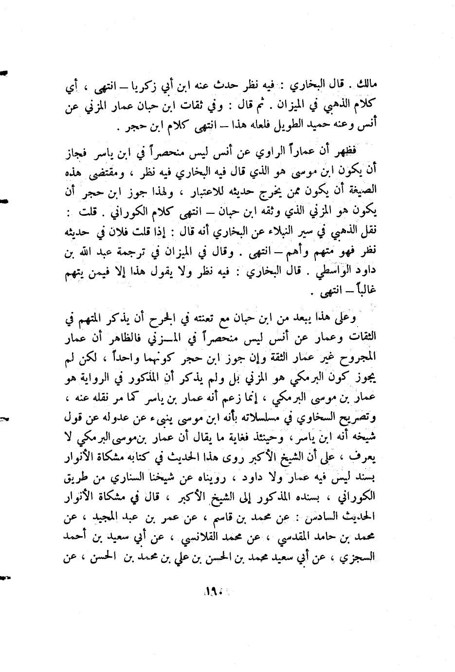 وعلى هذا يبعد من ابن حبان مع تعنته في الجرح أن يذكر المتهم في الثقات وعمار عن أنس ليس منحصراً في المزني فالظاهر أن عمار المجروح غير عمار الثقة وإن جوز ابن حجر كونهما واحداً، لكن لم يجوز كون البرمكي هو المزني بل ولم يذكر أن المذكور في الرواية هو عمار بن موسى البرمكي، إنما زعم أنه عمار بن ياسر كما مر نقله عنه، وتصريح السخاوي في مسلسلاته بأنه ابن موسى ينبئ عن عدوله عن قول شيخه انه ابن ياسر، وحينئذ فغاية ما يقال أن عمار بن موسى البرمكي لا يعرف، على أن الشيخ الأكبر روى هذا الحديث في كتابه مشكاة الأنوار بسند ليس فيه عمار ولا داود، رويناه عن شيخنا السناري من طريق الكوراني، بسنده المذكور إلى الشيخ الأكبر، قال في مشكاة الأنوار الحديث السادس: عن محمد بن قاسم، عن عمر بن عبد المجيد، عن محمد بن حامد المقدسي، عن محمد القلانسي، عن أبي سعيد بن أحمد السجزي، عن أبي سعيد محمد بن الحسن بن علي بن محمد بن الحسن، عن