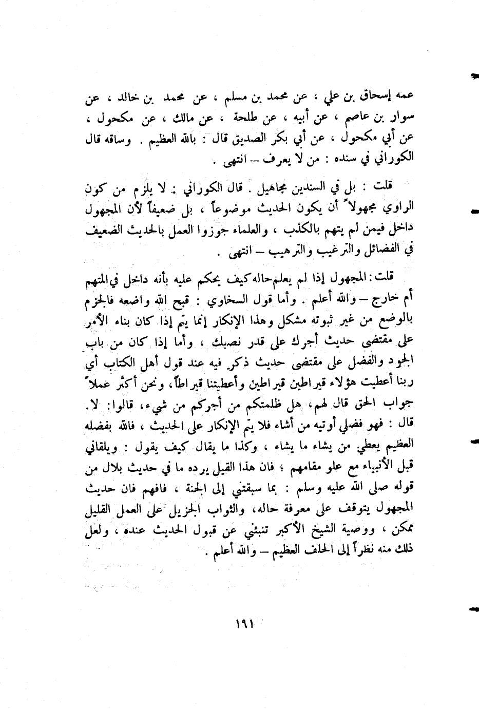 عمه إسحاق بن علي، عن محمد بن مسلم، عن محمد بن خالد، عن سوار بن عاصم، عن أبيه، عن طلحة، عن مالك، عن مكحول، عن أبي مكحول، عن أبي بكر الصديق قال: بالله العظيم. وساقه قال الكوراني في سنده: من لا يعرف - انتهى.