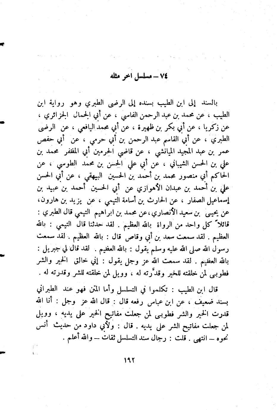 بالسند إلى ابن الطيب بسنده إلى الرضى الطبري وهو رواية ابن الطيب، عن محمد بن عبد الرحمن الفاسي، عن أبي الجمال الجزائري، عن زكريا، عن أبي بكر بن ظهيرة، عن أبي محمد اليافعي، عن الرضى الطبري، عن أبي القاسم عبد الرحمن بن أبي حرمي، عن أبي حفص عمر بن عبد المجيد الميانشي، عن قاضي الحرمين أبي المظفر محمد بن علي بن الحسن الشيباني، عن أبي علي الحسن بن محمد الطوسي، عن الحاكم أبي منصور محمد بن أحمد بن الحسين البيهقي، عن أبي الحسن علي بن أحمد بن عبدان الأهوازي عن أبي الحسين أحمد بن عبيد بن إسماعيل الصفار، عن الحارث بن أسامة التيمي، عن يزيد بن هارون، عن يحيى بن سعيد الأنصاري، عن محمد بن إبراهيم التيمي قال الطبري: قائلاً كل واحد من الرواة بالله العظيم. لقد حدثنا قال التيمي: بالله العظيم. لقد سمعت سعد بن أبي وقاص قال: بالله العظيم. لقد سمعت رسول الله صلى الله عليه وسلم يقول: بالله العظيم. لقد قال لي جبريل: بالله العظيم. لقد سمعت الله عز وجل يقول: إني خالق الخير والشر فطوبى لمن خلقته للخير وقدرته له، وويل لمن خلقته للشر وقدرته له.