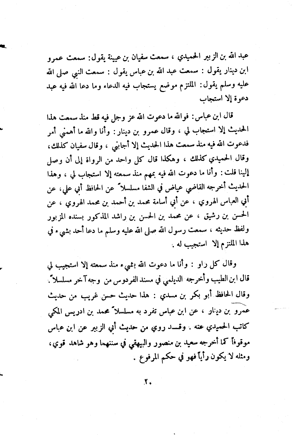 عبد الله بن الزبير الحميدي، سمعت سفيان بن عيينة يقول: سمعت عمرو بن دينار يقول: سمعت عبد الله بن عباس يقول: سمعت النبي صلى الله عليه وسلم يقول: الملتزم موضع يستجاب فيه الدعاء وما دعا الله فيه عبد دعوة إلا استجاب.