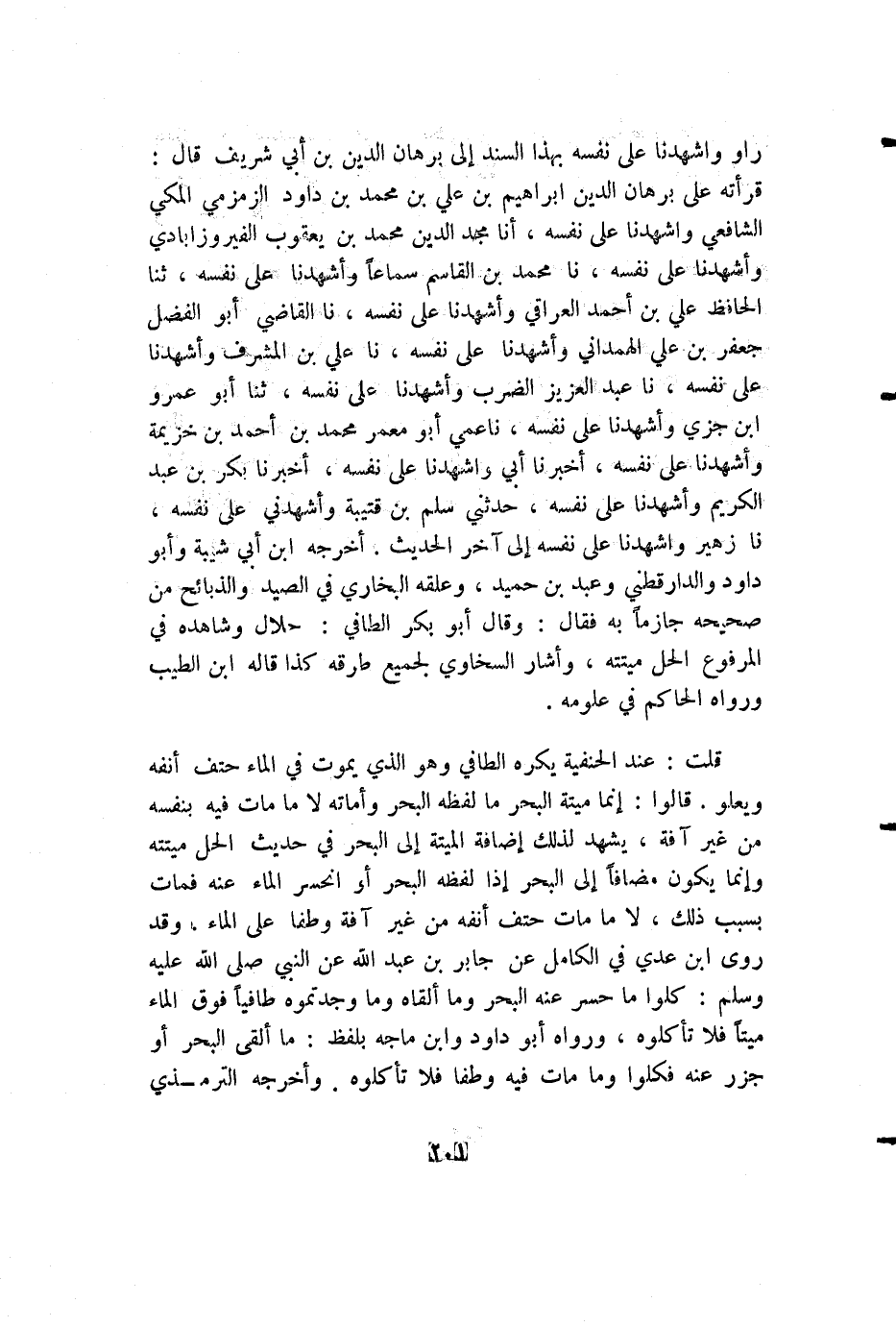 راو وأشهدنا على نفسه بهذا السند إلى برهان الدين بن أبي شريف قال: قرأته على برهان الدين إبراهيم بن علي بن محمد بن داود الزمزمي المكي الشافعي وأشهدنا على نفسه، أنا مجد الدين محمد بن يعقوب الفيروزابادي وأشهدنا على نفسه، نا محمد بن القاسم سماعاً وأشهدنا على نفسه، ثنا الحافظ علي بن أحمد العراقي وأشهدنا على نفسه، نا القاضي أبو الفضل جعفر بن علي الهمداني وأشهدنا على نفسه، نا علي بن المشرف وأشهدنا على نفسه، نا عبد العزيز الضرب وأشهدنا على نفسه، ثنا أبو عمرو بن جزي وأشهدنا على نفسه، نا عمي أبو معمر محمد بن أحمد بن خزيمة وأشهدنا على نفسه، أخبرنا أبي وأشهدنا على نفسه، أخبرنا بكر بن عبد الكريم وأشهدنا على نفسه، حدثني سلم بن قتيبة وأشهدني على نفسه، نا زهير وأشهدنا على نفسه إلى آخر الحديث. أخرجه ابن أبي شيبة وأبو داود والدارقطني وعبد بن حميد، وعلقه البخاري في الصيد والذبائح من صحيحه جازماً به فقال: وقال أبو بكر الطافي: حلال وشاهده في المرفوع الحل ميتته، وأشار السخاوي لجميع طرقه كذا قاله ابن الطيب ورواه الحاكم في علومه.