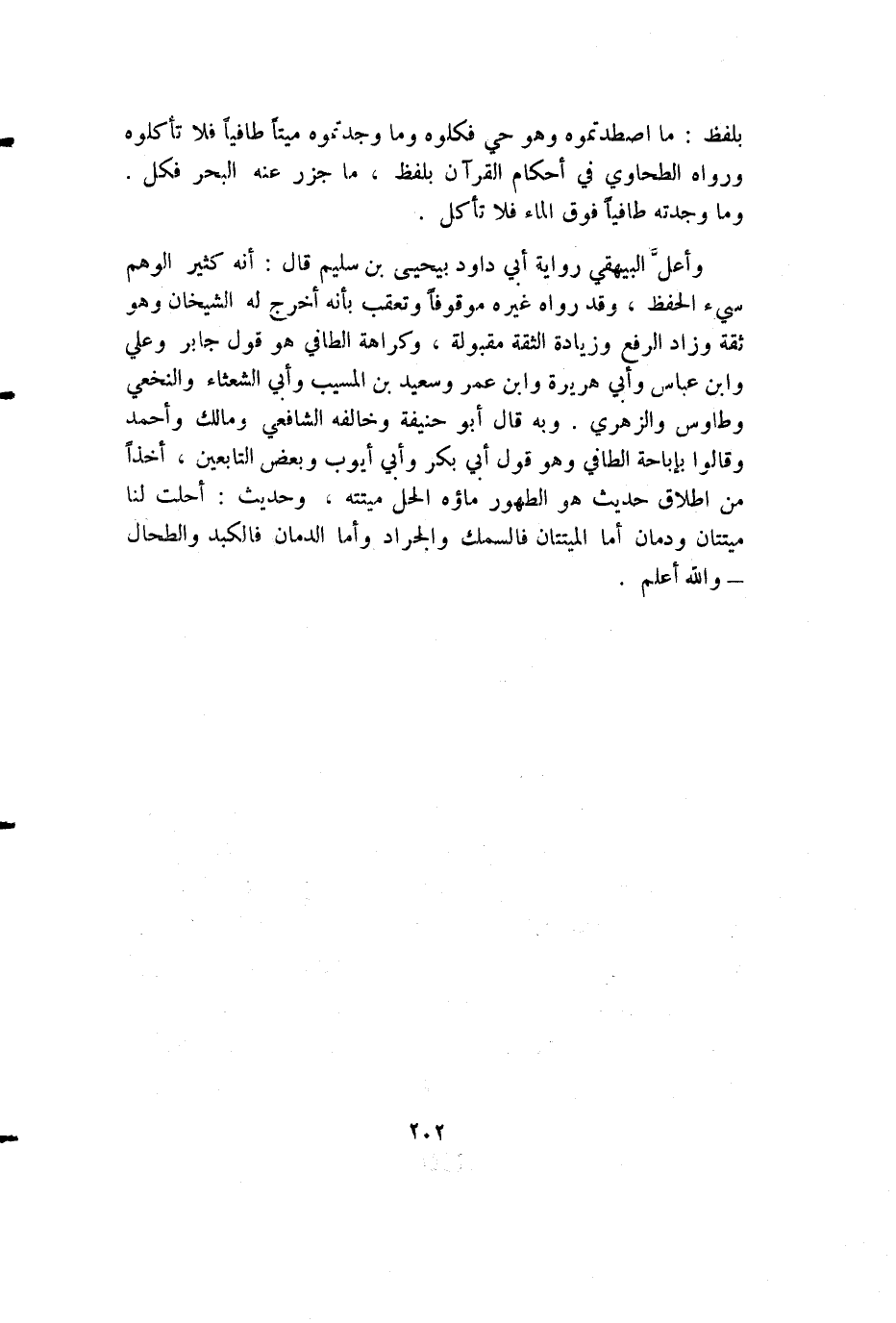 وأعلّ البيهقي رواية أبي داود بيحيى بن سليم قال: أنه كثير الوهم سيء الحفظ، وقد رواه غيره موقوفاً وتعقب بأنه أخرج له الشيخان وهو ثقة وزاد الرفع وزيادة الثقة مقبولة، وكراهة الطافي هو قول جابر وعلي وابن عباس وأبي هريرة وابن عمر وسعيد بن المسيب وأبي الشعثاء والنخعي وطاوس والزهري. وبه قال أبو حنيفة وخالفه الشافعي ومالك وأحمد وقالوا بإباحة الطافي وهو قول أبي بكر وأبي أيوب وبعض التابعين، أخذاً من إطلاق حديث هو الطهور ماؤه الحل ميتته، وحديث: أحلت لنا ميتتان ودمان أما الميتتان فالسمك والجراد وأما الدمان فالكبد والطحال - والله أعلم.