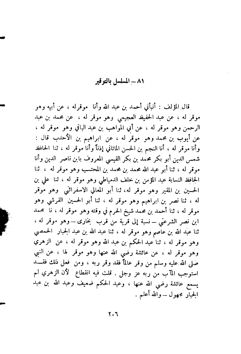 قال المؤلف: أنبأني أحمد بن عبد الله وأنا موقر له، عن أبيه وهو موقر له، عن عبد الحفيظ العجيمي وهو موقر له، عن محمد بن عبد الرحمن وهو موقر له، عن أبي المواهب بن عبد الباقي وهو موقر له، عن أيوب بن محمد وهو موقر له، عن إبراهيم بن الأحدب قال: وأنا موقر له، أنا النجم بن الحسن الماتاني إذناً وأنا موقر له، ثنا الحافظ شمس الدين أبو بكر محمد بن بكر القيسي المعروف بابن ناصر الدين وأنا موقر له، ثنا أبو عبد الله محمد بن محمد بن المحتسب وهو موقر له، ثنا الحافظ النسابة عبد المؤمن بن خلف الدمياطي وهو موقر له، ثنا علي بن الحسين بن المقير وهو موقر له، ثنا أبو المعالي الإسفرائني وهو موقر له، ثنا نصر بن إبراهيم وهو موقر له، ثنا أبو الحسين القرشي وهو موقر له، ثنا أحمد بن محمد شيخ الحرم في وقته وهو موقر له، نا محمد بن نصر الشرعتي - نسبة إلى قرية من قرب بخارى - وهو موقر له، ثنا عبد الله بن عاصم وهو موقر له، ثنا عبد الله بن عبد الجبار الحمصي وهو موقر له، ثنا عبد الحكم بن عبد الله وهو موقر له، عن الزهري وهو موقر له، عن عائشة رضي الله عنها وهو موقر لها، عن النبي صلى الله عليه وسلم من وقر عالماً فقد وقر ربه، ومن فعل ذلك فقد استوجب المآب من ربه عز وجل. قلت فيه انقطاع لأن الزهري لم يسمع عائشة رضي الله عنها، وعبد الحكم ضعيف وعبد الله بن عبد الجبار مجهول - والله أعلم.