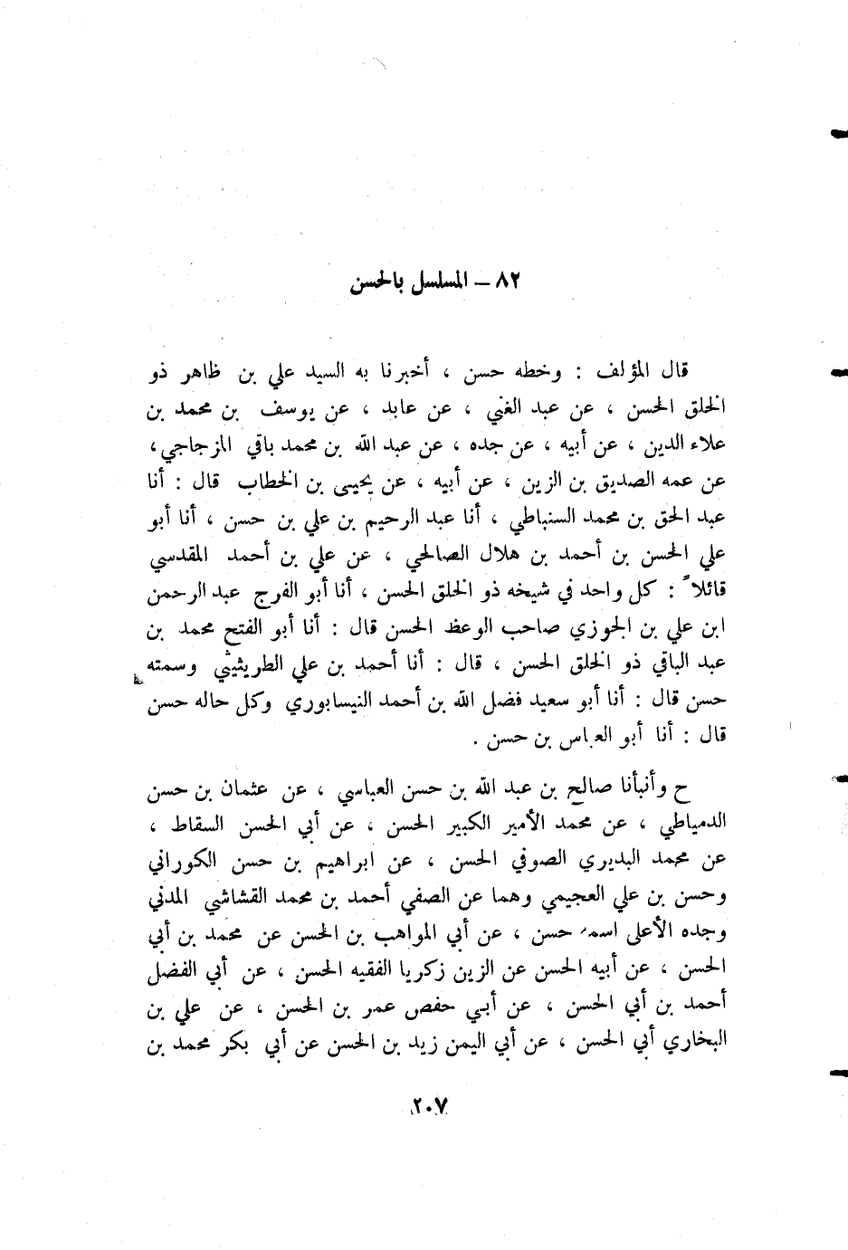 قال المؤلف: وخطه حسن، أخبرنا به السيد علي بن ظاهر ذو الخلق الحسن، عن عبد الغني، عن عابد، عن يوسف بن محمد بن علاء الدين، عن أبيه، عن جده، عن عبد الله بن محمد باقي المزجاجي، عن عمه الصديق بن الزين، عن أبيه، عن يحيى بن الخطاب قال: أنا عبد الحق بن محمد السنباطي، أنا عبد الرحيم بن علي بن حسن، أنا أبو علي الحسن بن أحمد بن هلال الصالحي، عن علي بن أحمد المقدسي قائلاً: كل واحد في شيخه ذو الخلق الحسن، أنا أبو الفرج عبد الرحمن بن علي بن الجوزي صاحب الوعظ الحسن قال: أنا أبو الفتح محمد بن عبد الباقي ذو الخلق الحسن، قال: أنا أحمد بن علي الطريثيثي وسمته حسن قال: أنا أبو سعيد فضل الله بن أحمد النيسابوري وكل حاله حسن قال: أنا أبو العباس بن حسن.