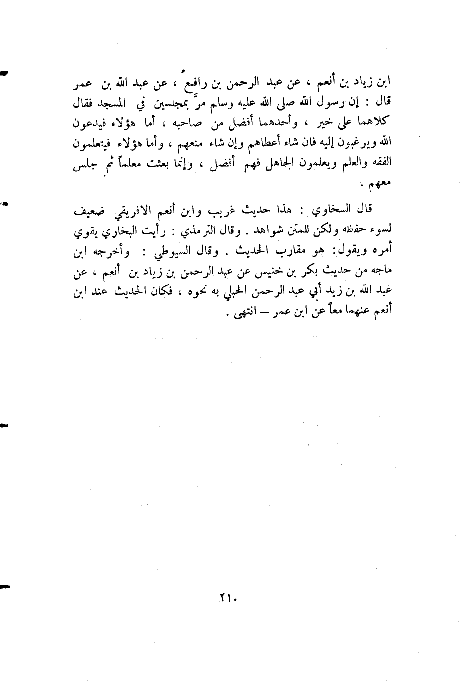 ابن زياد بن أنعم، عن عبد الرحمن بن رافع، عن عبد الله بن عمر قال: إن رسول الله صلى الله عليه وسلم مر بمجلسين في المسجد فقال كلاهما على خير، وأحدهما أفضل من صاحبه، أما هؤلاء فيدعون الله ويرغبون إليه فإن شاء أعطاهم وإن شاء منعهم، وأما هؤلاء فيتعلمون الفقه والعلم ويعلمون الجاهل فهم أفضل، وإنما بعثت معلما ثم جلس معهم.