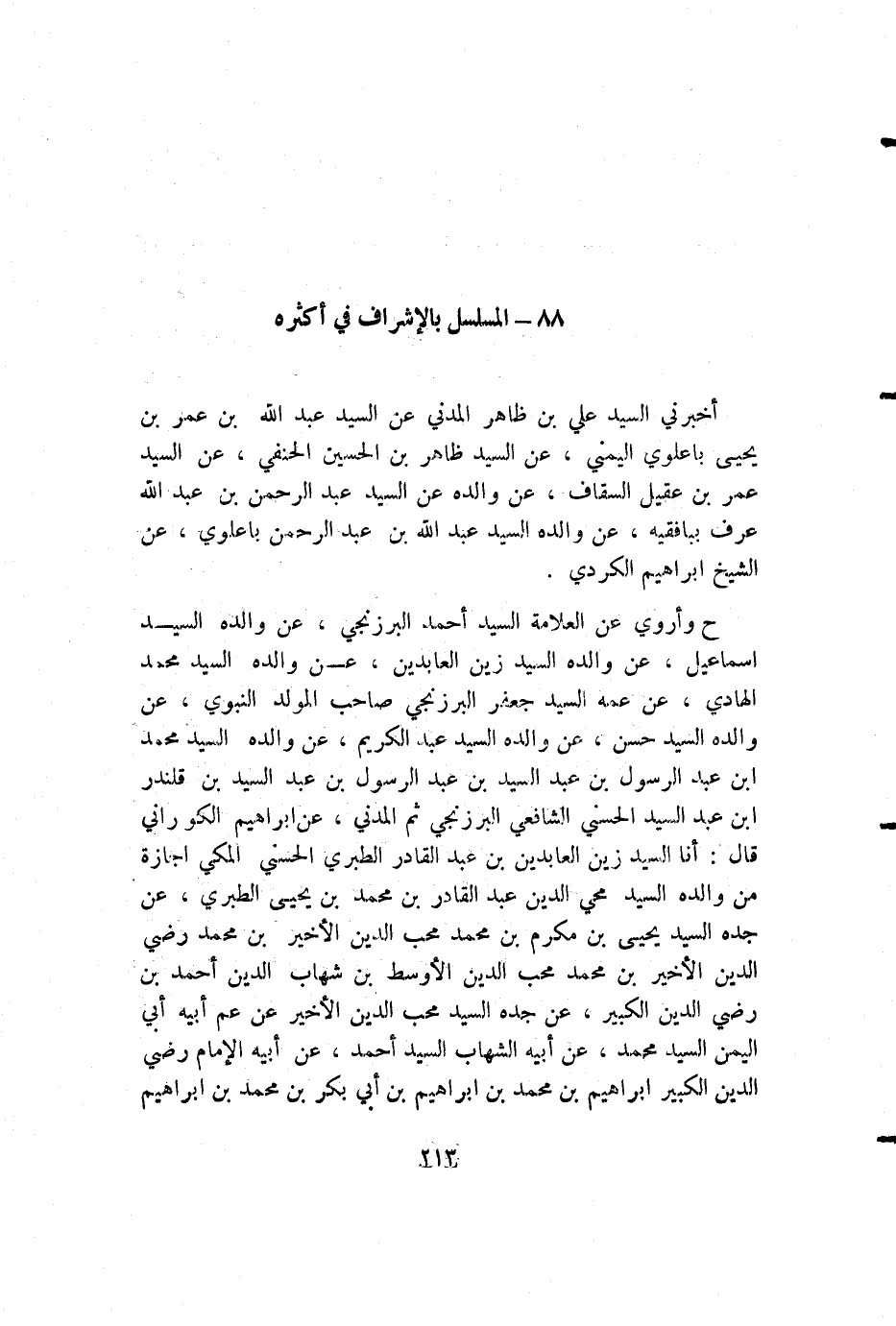 ح وأروي عن العلامة السيد أحمد البرزنجي، عن والده السيد إسماعيل، عن والده السيد زين العابدين، عن والده السيد محمد الهادي، عن عمه السيد جعفر البرزنجي صاحب المولد النبوي، عن والده السيد حسن، عن والده السيد عبد الكريم، عن والده السيد محمد بن عبد الرسول بن عبد السيد بن عبد الرسول بن عبد السيد بن قلندر بن عبد السيد الحسني الشافعي البرزنجي ثم المدني، عن إبراهيم الكوراني قال: أنا السيد زين العابدين بن عبد القادر الطبري الحسني المكي إجازة من والده السيد محي الدين عبد القادر بن محمد بن يحيى الطبري، عن جده السيد يحيى بن مكرم بن محمد محب الدين الأخير بن محمد رضي الدين الأخير بن محمد محب الدين الأوسط بن شهاب الدين أحمد بن رضي الدين الكبير، عن جده السيد محب الدين الأخير عن عم أبيه أبي اليمن السيد محمد، عن أبيه الشهاب السيد أحمد، عن أبيه الإمام رضي الدين الكبير إبراهيم بن محمد بن إبراهيم بن أبي بكر بن محمد بن إبراهيم