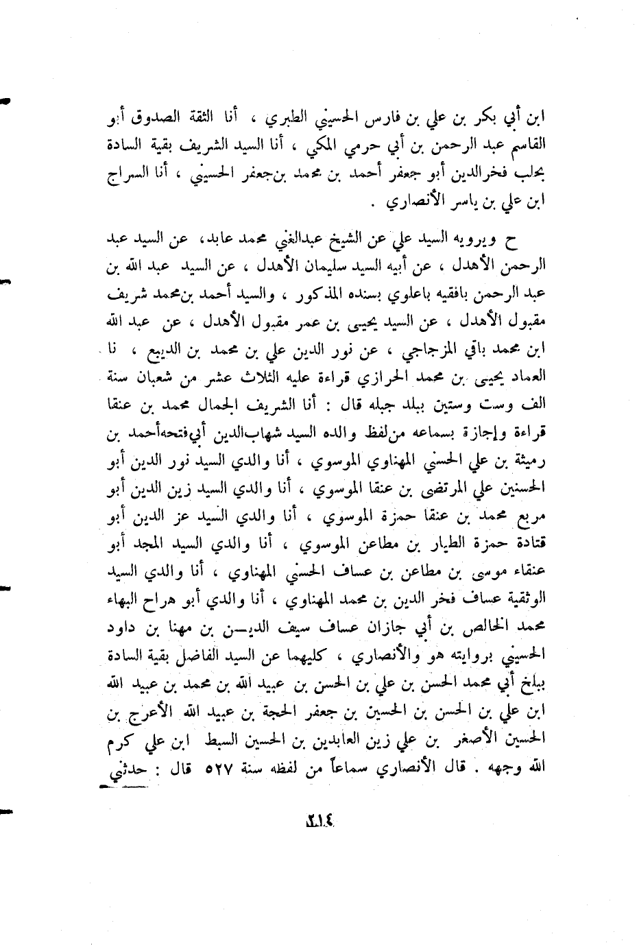 ح ويرويه السيد علي عن الشيخ عبد الغني محمد عابد، عن السيد عبد الرحمن الأهدل، عن أبيه السيد سليمان الأهدل، عن السيد عبد الله بن عبد الرحمن بافقيه باعلوي بسنده المذكور، والسيد أحمد بن محمد شريف مقبول الأهدل، عن السيد يحيى بن عمر مقبول الأهدل، عن عبد الله بن محمد باقي المزجاجي، عن نور الدين علي بن محمد بن الديبع، نا العماد يحيى بن محمد الحرازي قراءة عليه الثلاث عشر من شعبان سنة ألف وست وستين ببلد جبله قال: أنا الشريف الجمال محمد بن عنقا قراءة وإجازة بسماعه من لفظ والده السيد شهاب الدين أبي فتحه أحمد بن رميثة بن علي الحسني المهناوي الموسوي، أنا والدي السيد نور الدين أبو الحسنين علي المرتضى بن عنقا الموسوي، أنا والدي السيد زين الدين أبو مربع محمد بن عنقا حمزة الموسوي، أنا والدي السيد عز الدين أبو قتادة حمزة الطيار بن مطاعن الموسوي، أنا والدي السيد المجد أبو عنقاء موسى بن مطاعن بن عساف الحسني المهناوي، أنا والدي السيد الوثقية عساف فخر الدين بن محمد المهناوي، أنا والدي أبو هراح البهاء محمد الخالص بن أبي جازان عساف سيف الدين بن مهنا بن داود الحسيني بروايته هو والأنصاري، كليهما عن السيد الفاضل بقية السادة ببلخ أبي محمد الحسن بن علي بن الحسن بن عبيد الله بن محمد بن عبيد الله بن علي بن الحسن بن الحسين بن جعفر الحجة بن عبيد الله الأعرج بن الحسين الأصغر بن علي زين العابدين بن الحسين السبط ابن علي كرم الله وجهه. قال الأنصاري سماعاً من لفظه سنة 527 قال: حدثني