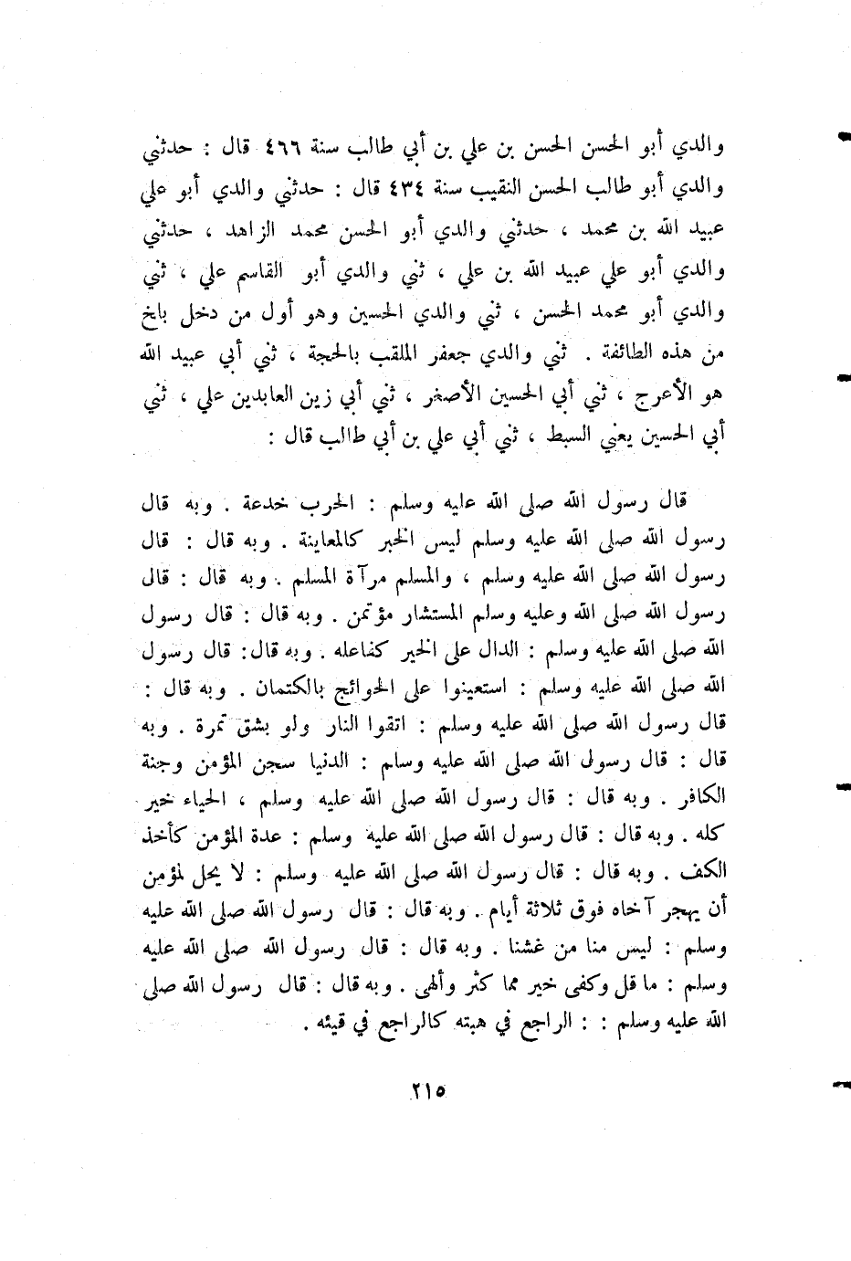 والدي أبو الحسن الحسن بن علي بن أبي طالب سنة 466 قال: حدثني والدي أبو طالب الحسن النقيب سنة 434 قال: حدثني والدي أبو علي عبيد الله بن محمد، حدثني والدي أبو الحسن محمد الزاهد، حدثني والدي أبو علي عبيد الله بن علي، ثني والدي أبو القاسم علي، ثني والدي أبو محمد الحسن، ثني والدي الحسين وهو أول من دخل بلخ من هذه الطائفة. ثني والدي جعفر الملقب بالحجة، ثني أبي عبيد الله هو الأعرج، ثني أبي الحسين الأصغر، ثني أبي زين العابدين علي، ثني أبي الحسين يعني السبط، ثني أبي علي بن أبي طالب قال: