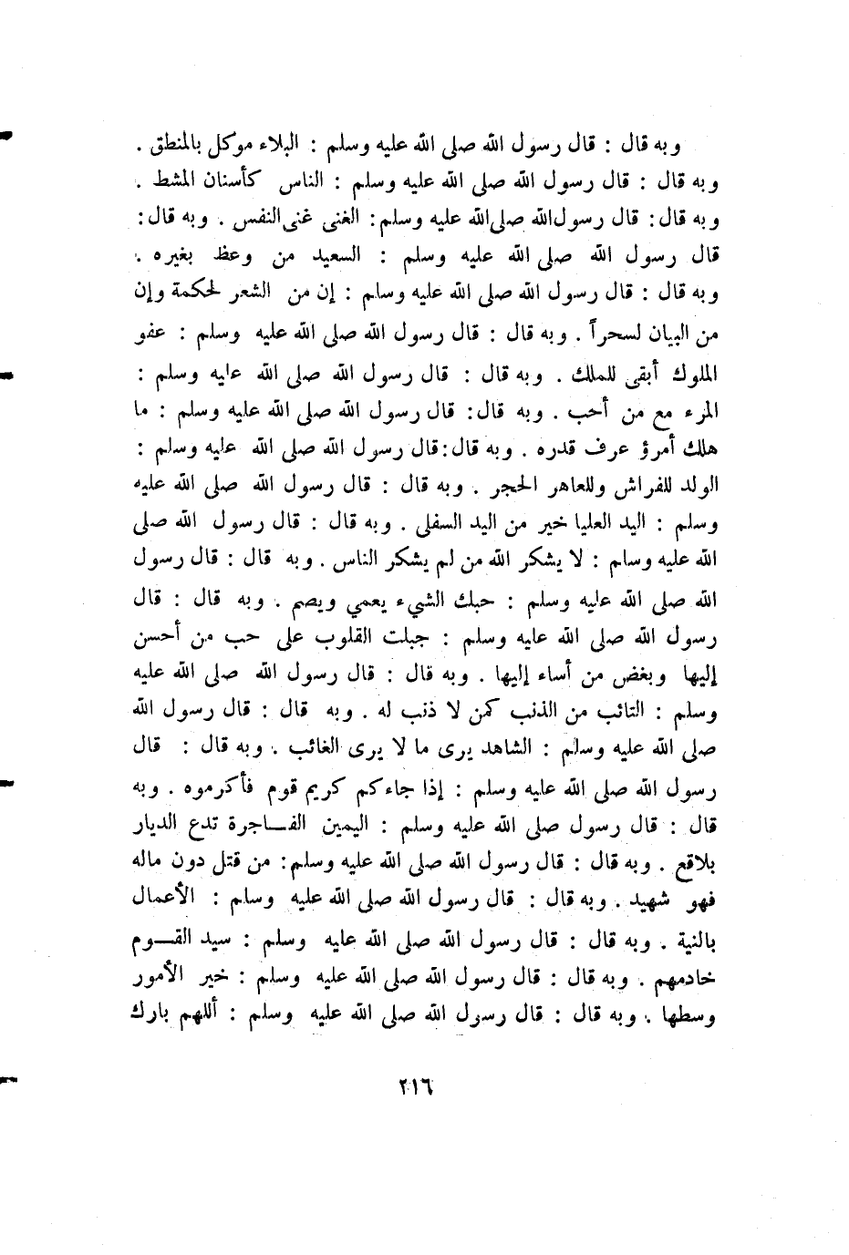 وبه قال: قال رسول الله صلى الله عليه وسلم: البلاء موكل بالمنطق. وبه قال: قال رسول الله صلى الله عليه وسلم: الناس كأسنان المشط. وبه قال: قال رسول الله صلى الله عليه وسلم: الغنى غنى النفس. وبه قال: قال رسول الله صلى الله عليه وسلم: السعيد من وعظ بغيره. وبه قال: قال رسول الله صلى الله عليه وسلم: إن من الشعر لحكمة وإن من البيان لسحرا. وبه قال: قال رسول الله صلى الله عليه وسلم: عفو الملوك أبقى للملك. وبه قال: قال رسول الله صلى الله عليه وسلم: المرء مع من أحب. وبه قال: قال رسول الله صلى الله عليه وسلم: ما هلك امرؤ عرف قدره. وبه قال: قال رسول الله صلى الله عليه وسلم: الولد للفراش وللعاهر الحجر. وبه قال: قال رسول الله صلى الله عليه وسلم: اليد العليا خير من اليد السفلى. وبه قال: قال رسول الله صلى الله عليه وسلم: لا يشكر الله من لم يشكر الناس. وبه قال: قال رسول الله صلى الله عليه وسلم: حبك الشيء يعمي ويصم. وبه قال: قال رسول الله صلى الله عليه وسلم: جبلت القلوب على حب من أحسن إليها وبغض من أساء إليها. وبه قال: قال رسول الله صلى الله عليه وسلم: التائب من الذنب كمن لا ذنب له. وبه قال: قال رسول الله صلى الله عليه وسلم: الشاهد يرى ما لا يرى الغائب. وبه قال: قال رسول الله صلى الله عليه وسلم: إذا جاءكم كريم قوم فأكرموه. وبه قال: قال رسول الله صلى الله عليه وسلم: اليمين الفاجرة تدع الديار بلاقع. وبه قال: قال رسول الله صلى الله عليه وسلم: من قتل دون ماله فهو شهيد. وبه قال: قال رسول الله صلى الله عليه وسلم: الأعمال بالنية. وبه قال: قال رسول الله صلى الله عليه وسلم: سيد القوم خادمهم. وبه قال: قال رسول الله صلى الله عليه وسلم: خير الأمور وسطها، وبه قال: قال رسول الله صلى الله عليه وسلم: اللهم بارك