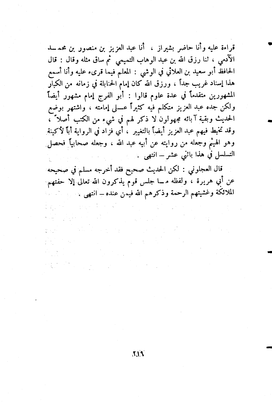 قراءة عليه وأنا حاضر بشيراز، أنا عبد العزيز بن منصور بن محمد الآدمي، ثنا رزق الله بن عبد الوهاب التميمي ثم ساق مثله وقال: قال الحافظ أبو سعيد بن العلائي في الوشي: المعلم فيما قرئ عليه وأنا أسمع هذا إسناد غريب جدا، ورزق الله كان إمام الحنابلة في زمانه من الكبار المشهورين متقدما في عدة علوم قالوا: أبو الفرج إمام مشهور أيضا ولكن جده عبد العزيز متكلم فيه كثيرا على إمامته، واشتهر بوضع الحديث وبقية آبائه مجهولون لا ذكر لهم في شيء من الكتب أصلا، وقد تخبط فيهم عبد العزيز أيضا بالتغيير، أي فزاد في الرواية أبا لأكينة وهو الهيثم وجعله من روايته عن أبيه عبد الله، وجعله صحابيا فحصل التسلسل في هذا باثني عشر - انتهى.