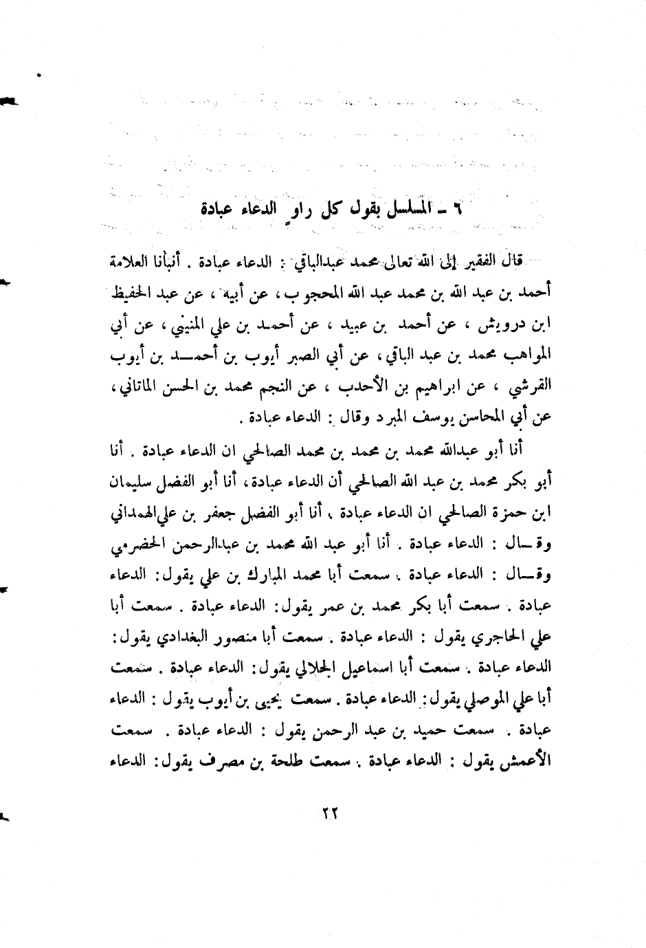 أنا أبو عبد الله محمد بن محمد بن محمد الصالحي أن الدعاء عبادة. أنا أبو بكر محمد بن عبد الله الصالحي أن الدعاء عبادة، أنا أبو الفضل سليمان بن حمزة الصالحي أن الدعاء عبادة، أنا أبو الفضل جعفر بن علي الهمداني وقال: الدعاء عبادة. أنا أبو عبد الله محمد بن عبد الرحمن الحضرمي وقال: الدعاء عبادة، سمعت أبا محمد المبارك بن علي يقول: الدعاء عبادة. سمعت أبا بكر محمد بن عمر يقول: الدعاء عبادة. سمعت أبا علي الحاجري يقول: الدعاء عبادة. سمعت أبا منصور البغدادي يقول: الدعاء عبادة. سمعت أبا إسماعيل الجلالي يقول: الدعاء عبادة. سمعت أبا علي الموصلي يقول: الدعاء عبادة. سمعت يحيى بن أيوب يقول: الدعاء عبادة. سمعت حميد بن عبد الرحمن يقول: الدعاء عبادة. سمعت الأعمش يقول: الدعاء عبادة. سمعت طلحة بن مصرف يقول: الدعاء