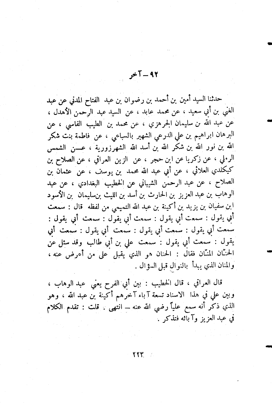 حدثنا السيد أمين بن أحمد بن رضوان بن عبد الفتاح المدني عن عبد الغني بن أبي سعيد، عن محمد عابد، عن السيد عبد الرحمن الأهدل، عن عبد الله بن سليمان الجرهزي، عن محمد بن الطيب الفاسي، عن البرهان إبراهيم بن علي الدرعي الشهير بالسباعي، عن فاطمة بنت شكر الله بن نور الله بن شكر الله بن أسد الله الشهرزورية، عن الشمس الرملي، عن زكريا عن ابن حجر، عن الزين العراقي، عن الصلاح بن كيكلدي العلائي، عن أبي عبد الله محمد بن يوسف، عن عثمان بن الصلاح، عن عبد الرحمن الشيباني عن الخطيب البغدادي، عن عبد الوهاب بن عبد العزيز بن الحارث بن أسد بن الليث بن سليمان بن الأسود بن سفيان بن يزيد بن أكينة بن عبد الله التميمي من لفظه قال: سمعت أبي يقول: سمعت أبي يقول: سمعت أبي يقول: سمعت أبي يقول: سمعت أبي يقول: سمعت أبي يقول: سمعت أبي يقول: سمعت أبي يقول: سمعت أبي يقول: سمعت علي بن أبي طالب وقد سئل عن الحنّان المنّان فقال: الحنان هو الذي يقبل على من أعرض عنه، والمنان الذي يبدأ بالنوال قبل السؤال.