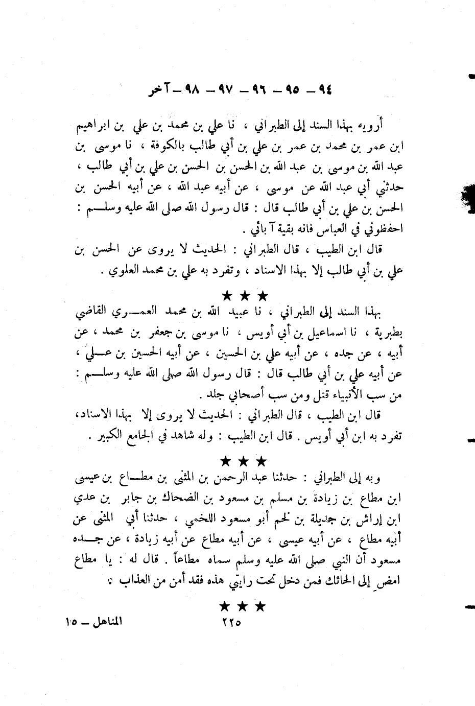 أرويه بهذا السند إلى الطبراني، نا علي بن محمد بن علي بن إبراهيم بن عمر بن محمد بن عمر بن علي بن أبي طالب بالكوفة، نا موسى بن عبد الله بن موسى بن عبد الله بن الحسن بن الحسن بن علي بن أبي طالب، حدثني أبي عبد الله عن موسى، عن أبيه عبد الله، عن أبيه الحسن بن الحسن بن علي بن أبي طالب قال: قال رسول الله صلى الله عليه وسلم: احفظوني في العباس فإنه بقية آبائي.