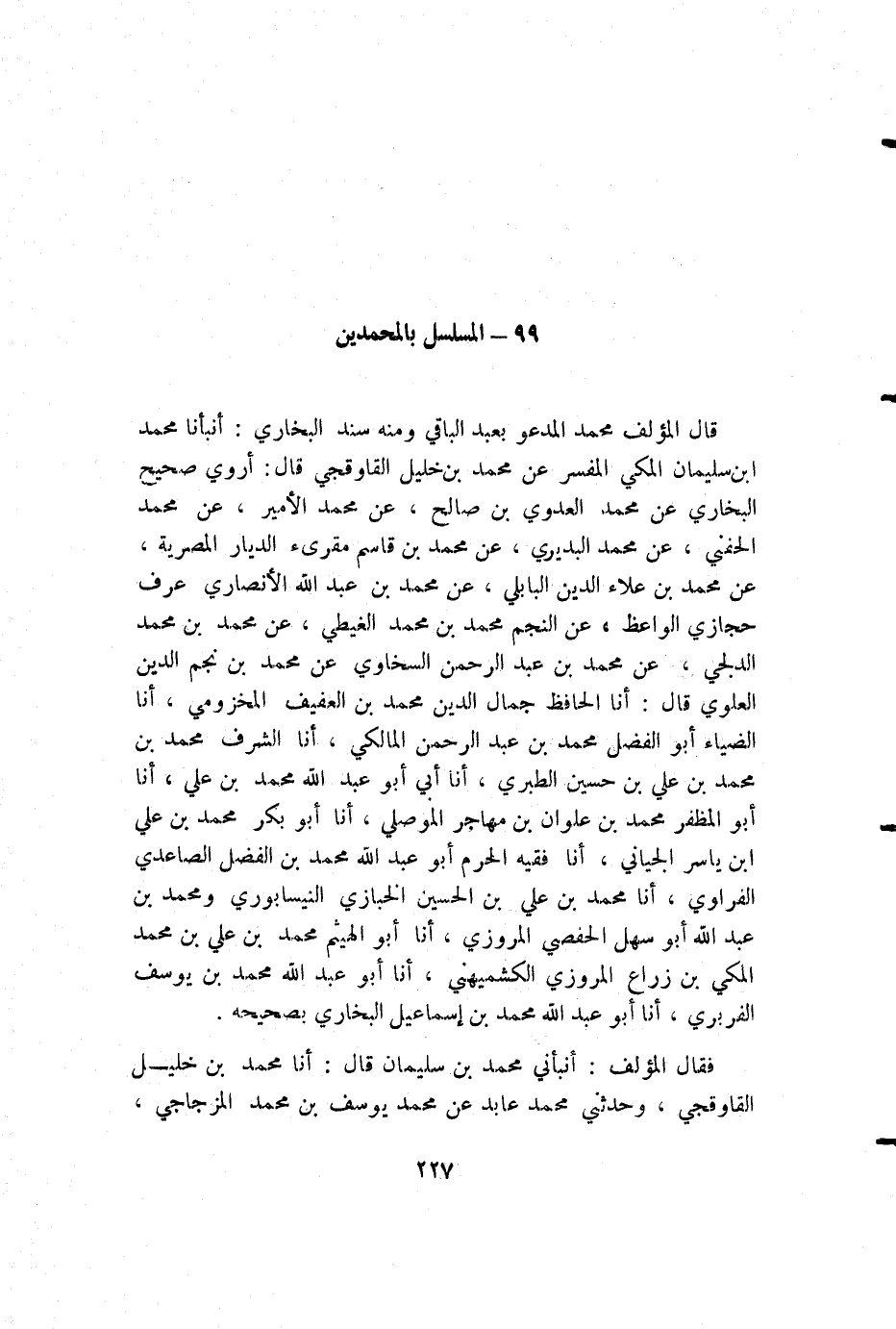 قال المؤلف محمد المدعو بعبد الباقي ومنه سند البخاري: أنبأنا محمد بن سليمان المكي المفسر عن محمد بن خليل القاوقجي قال: أروي صحيح البخاري عن محمد العدوي بن صالح، عن محمد الأمير، عن محمد الحفني، عن محمد البديري، عن محمد بن قاسم مقرئ الديار المصرية، عن محمد بن علاء الدين البابلي، عن محمد بن عبد الله الأنصاري عرف حجازي الواعظ، عن النجم محمد بن محمد الغيطي، عن محمد بن محمد الدلجي، عن محمد بن عبد الرحمن السخاوي عن محمد بن نجم الدين العلوي قال: أنا الحافظ جمال الدين محمد بن العفيف المخزومي، أنا الضياء أبو الفضل محمد بن عبد الرحمن المالكي، أنا الشرف محمد بن محمد بن علي بن حسين الطبري، أنا أبي أبو عبد الله محمد بن علي، أنا أبو المظفر محمد بن علوان بن مهاجر الموصلي، أنا أبو بكر محمد بن علي بن ياسر الجياني، أنا فقيه الحرم أبو عبد الله محمد بن الفضل الصاعدي الفراوي، أنا محمد بن علي بن الحسين الخبازي النيسابوري ومحمد بن عبد الله أبو سهل الحفصي المروزي، أنا أبو الهيثم محمد بن علي بن محمد المكي بن زراع المروزي الكشميهني، أنا أبو عبد الله محمد بن يوسف الفربري، أنا أبو عبد الله محمد بن إسماعيل البخاري بصحيحه.