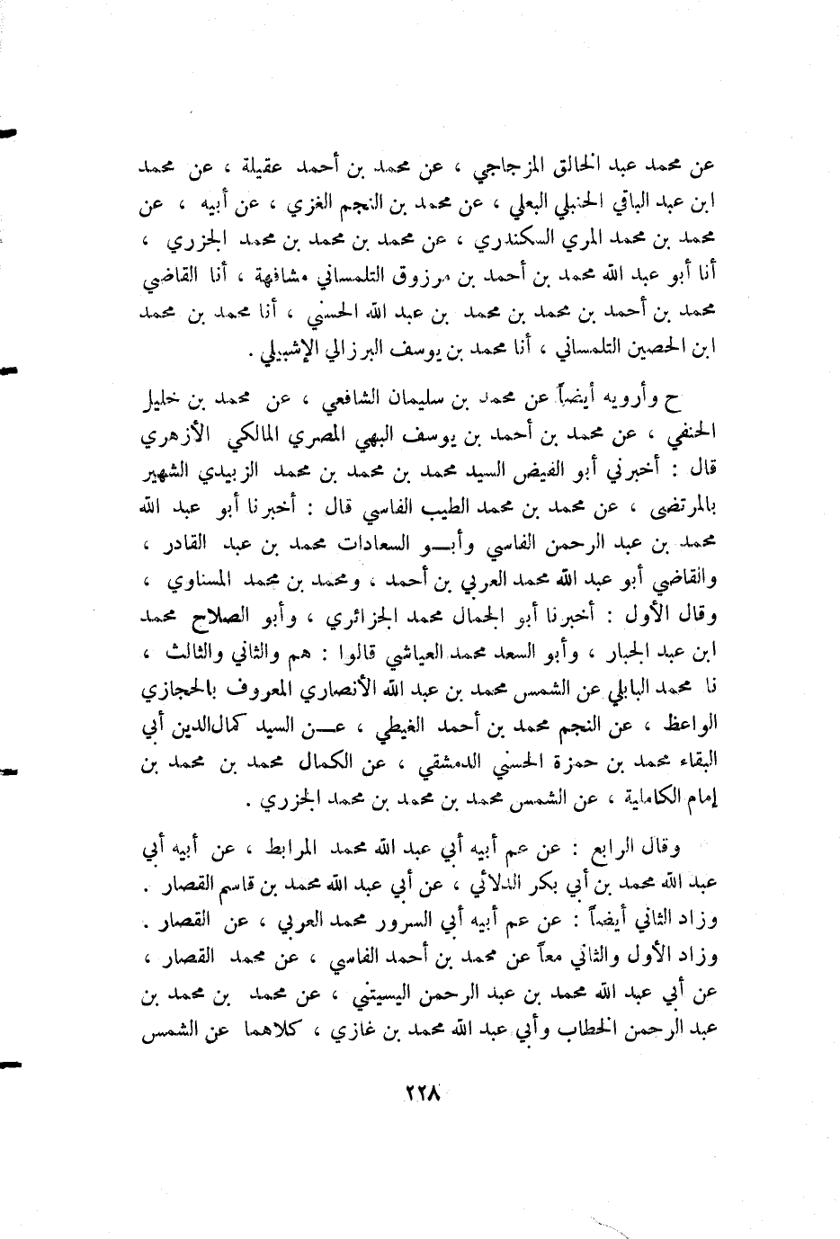 ح وأرويه أيضا عن محمد بن سليمان الشافعي، عن محمد بن خليل الحنفي، عن محمد بن أحمد بن يوسف البهي المصري المالكي الأزهري قال: أخبرني أبو الفيض السيد محمد بن محمد بن محمد الزبيدي الشهير بالمرتضى، عن محمد بن محمد الطيب الفاسي قال: أخبرنا أبو عبد الله محمد بن عبد الرحمن الفاسي وأبو السعادات محمد بن عبد القادر، والقاضي أبو عبد الله محمد العربي بن أحمد، ومحمد بن محمد المسناوي، وقال الأول: أخبرنا أبو الجمال محمد الجزائري، وأبو الصلاح محمد بن عبد الجبار، وأبو السعد محمد العياشي قالوا: هم والثاني والثالث، نا محمد البابلي عن الشمس محمد بن عبد الله الأنصاري المعروف بالحجازي الواعظ، عن النجم محمد بن أحمد الغيطي، عن السيد كمال الدين أبي البقاء محمد بن حمزة الحسني الدمشقي، عن الكمال محمد بن محمد بن إمام الكاملية، عن الشمس محمد بن محمد بن محمد الجزري.