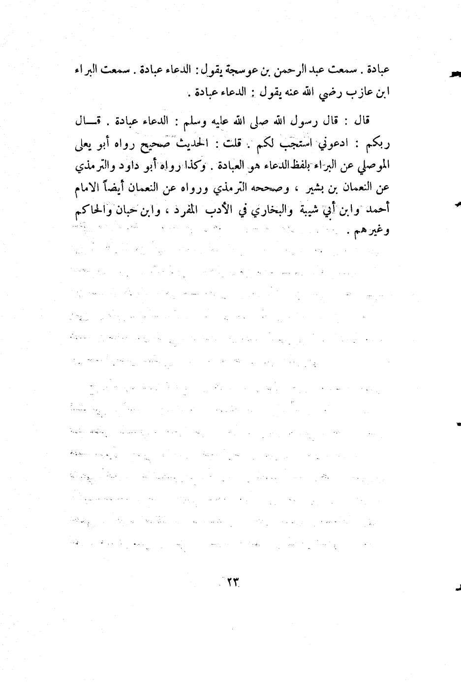 عبادة. سمعت عبد الرحمن بن عوسجة يقول: الدعاء عبادة. سمعت البراء بن عازب رضي الله عنه يقول: الدعاء عبادة.