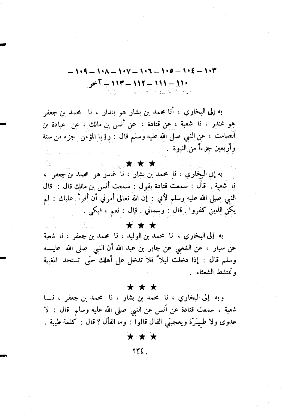 به إلى البخاري، أنا محمد بن بشار هو بندار، نا محمد بن جعفر هو غندر، نا شعبة، عن قتادة، عن أنس بن مالك، عن عبادة بن الصامت، عن النبي صلى الله عليه وسلم قال: رؤيا المؤمن جزء من ستة وأربعين جزءا من النبوة.