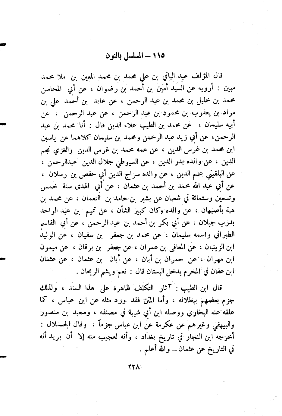 قال المؤلف عبد الباقي بن علي محمد بن محمد المعين بن ملا محمد مبين: أرويه عن السيد أمين بن أحمد بن رضوان، عن أبي المحاسن محمد بن خليل بن محمد بن عبد الرحمن، عن عابد بن أحمد علي بن مراد بن يعقوب بن محمود بن عبد الرحمن، عن عبد الرحمن، عن أبيه سليمان، عن محمد بن الطيب علاء الدين قال: أنا محمد بن عبد الرحمن، عن أبي زيد عبد الرحمن ومحمد بن سليمان كلاهما عن ياسين بن محمد بن غرس الدين، عن عمه محمد بن غرس الدين والغزي نجم الدين، عن والده بدر الدين، عن السيوطي جلال الدين عبد الرحمن، عن البلقيني علم الدين، عن والده سراج الدين أبي حفص بن رسلان، عن أبي عبد الله محمد بن أحمد بن عثمان، عن أبي الهدى سنة خمس وتسعين وستمائة في شعبان عن بشير بن حامد بن النعمان، عن محمد بن هبة بأصبهان، عن والده وكان كبير الشأن، عن تميم بن عبد الواحد بدرب جيلان، عن أبي بكر بن أحمد بن عبد الرحمن، عن أبي القاسم الطبراني واسمه سليمان، عن محمد بن جعفر بن سفيان، عن الوليد ابن الزينبان، عن المعافى بن عمران، عن جعفر بن برقان، عن ميمون بن مهران، عن حمران بن أبان، عن أبان بن عثمان، عن عثمان بن عفان في المحرم يدخل البستان قال: نعم ويشم الريحان.