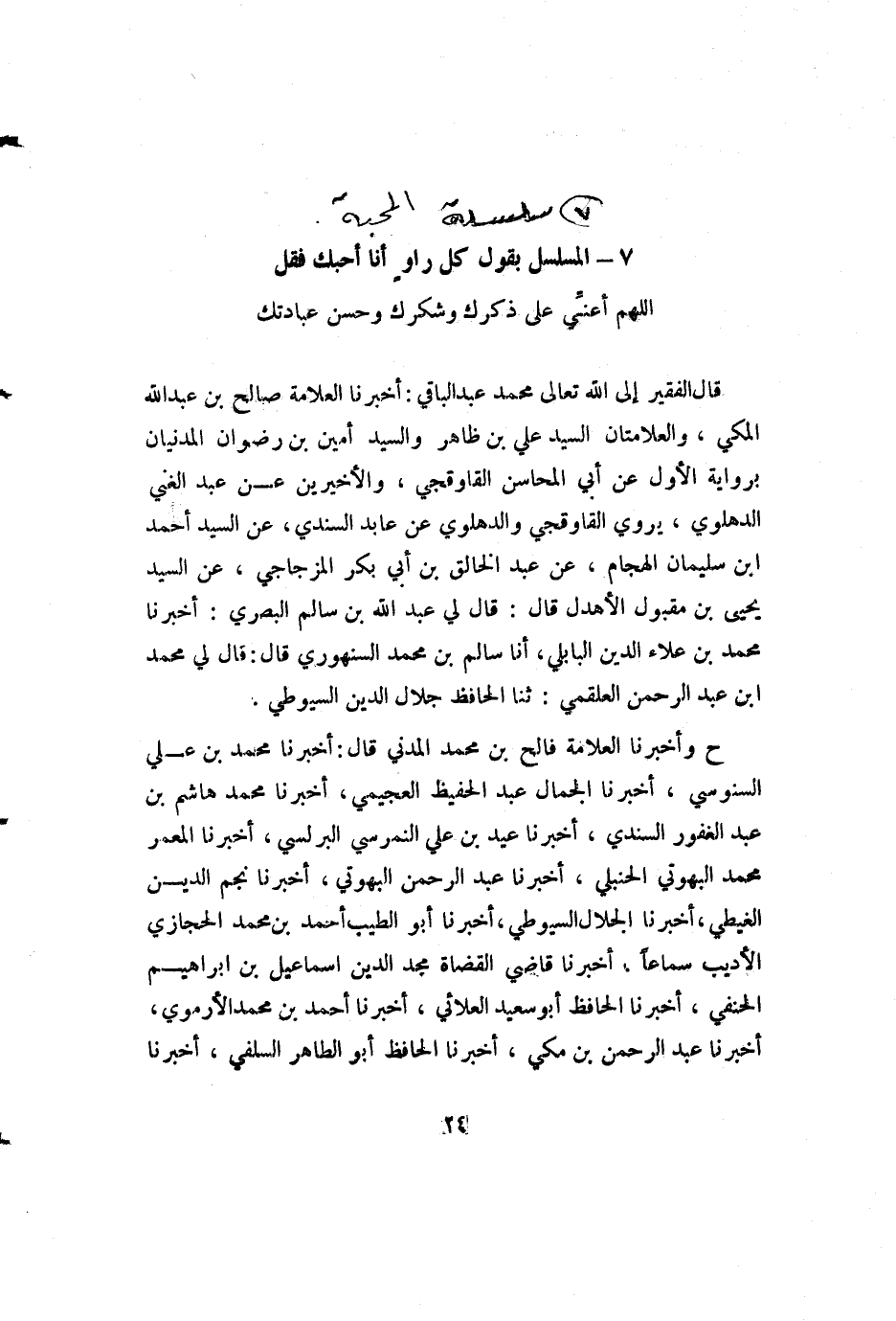 قال الفقير إلى الله تعالى محمد عبد الباقي: أخبرنا العلامة صالح بن عبد الله المكي، والعلامتان السيد علي بن ظاهر والسيد أمين بن رضوان المدنيان برواية الأول عن أبي المحاسن القاوقجي، والأخيرين عن عبد الغني الدهلوي، يروي القاوقجي والدهلوي عن عابد السندي، عن السيد أحمد بن سليمان الهجام، عن عبد الخالق بن أبي بكر المزجاجي، عن السيد يحيى بن مقبول الأهدل قال: قال لي عبد الله بن سالم البصري: أخبرنا محمد بن علاء الدين البابلي، أنا سالم بن محمد السنهوري قال: قال لي محمد بن عبد الرحمن العلقمي: ثنا الحافظ جلال الدين السيوطي.