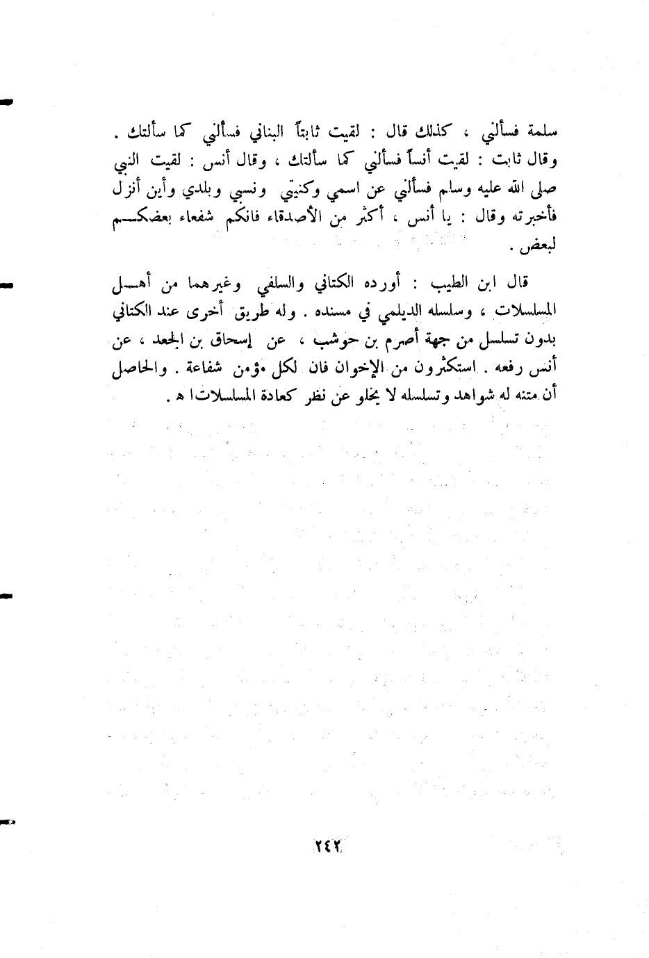 سلمة فسألني، كذلك قال: لقيت ثابتا البناني فسألني كما سألتك. وقال ثابت: لقيت أنساً فسألني كما سألتك، وقال أنس: لقيت النبي صلى الله عليه وسلم فسألني عن اسمي وكنيتي ونسبي وبلدي وأين أنزل فأخبرته وقال: يا أنس، أكثر من الأصدقاء فإنكم شفعاء بعضكم لبعض.