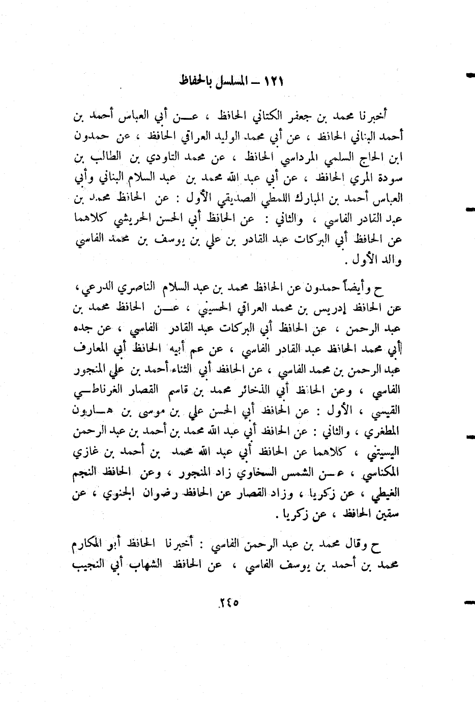 أخبرنا محمد بن جعفر الكتاني الحافظ، عن أبي العباس أحمد بن أحمد البناني الحافظ، عن أبي محمد الوليد العراقي الحافظ، عن حمدون ابن الحاج السلمي المرداسي الحافظ، عن محمد التاودي بن الطالب بن سودة المري الحافظ، عن أبي عبد الله محمد بن عبد السلام البناني وأبي العباس أحمد بن المبارك اللمطي الصديقي الأول: عن الحافظ محمد بن عبد القادر الفاسي، والثاني: عن الحافظ أبي الحسن الحريشي كلاهما عن الحافظ أبي البركات عبد القادر بن علي بن يوسف بن محمد الفاسي والد الأول.