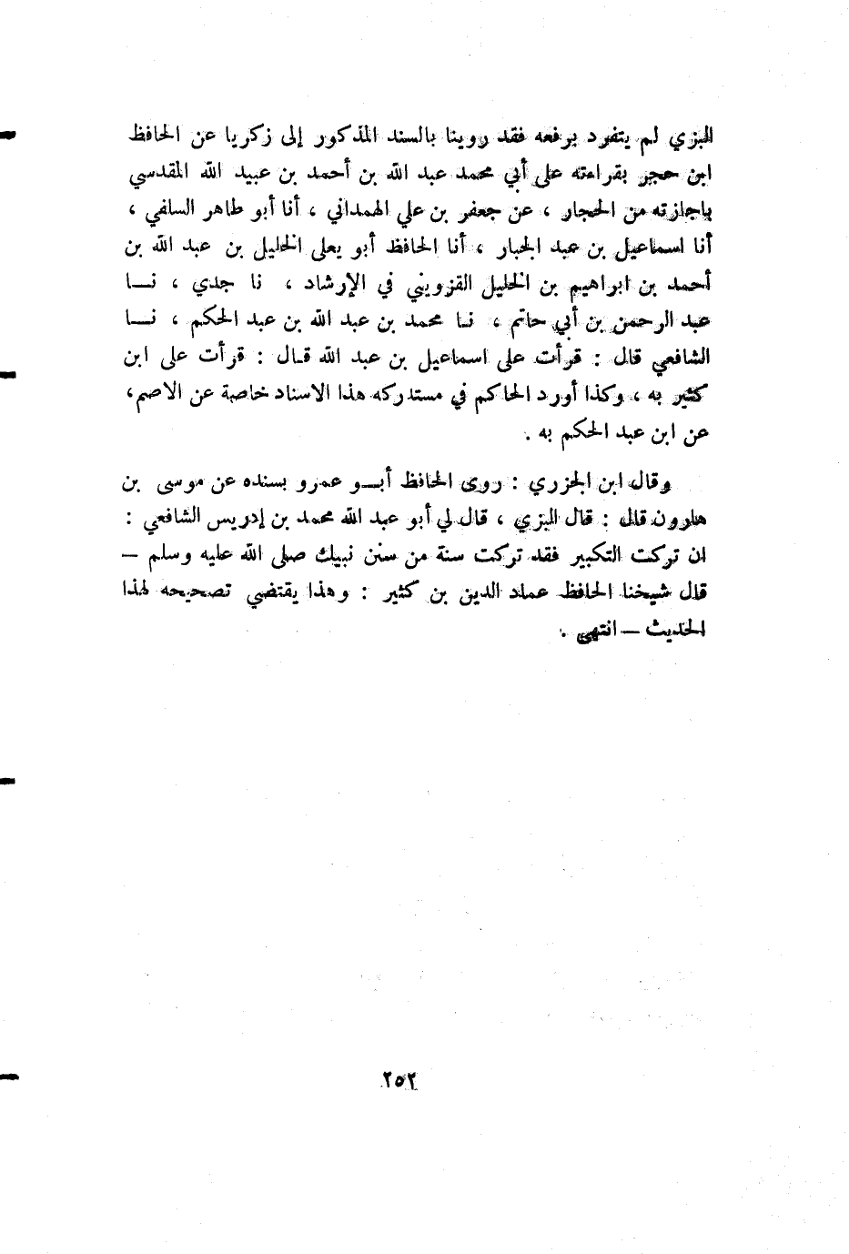 وقال ابن الجزري: روى الحافظ أبو عمرو بسنده عن موسى بن هارون قال: قال البزي، قال لي أبو عبد الله محمد بن إدريس الشافعي: إن تركت التكبير فقد تركت سنة من سنن نبيك صلى الله عليه وسلم - قال شيخنا الحافظ عماد الدين بن كثير: وهذا يقتضي تصحيحه لهذا الحديث - انتهى.